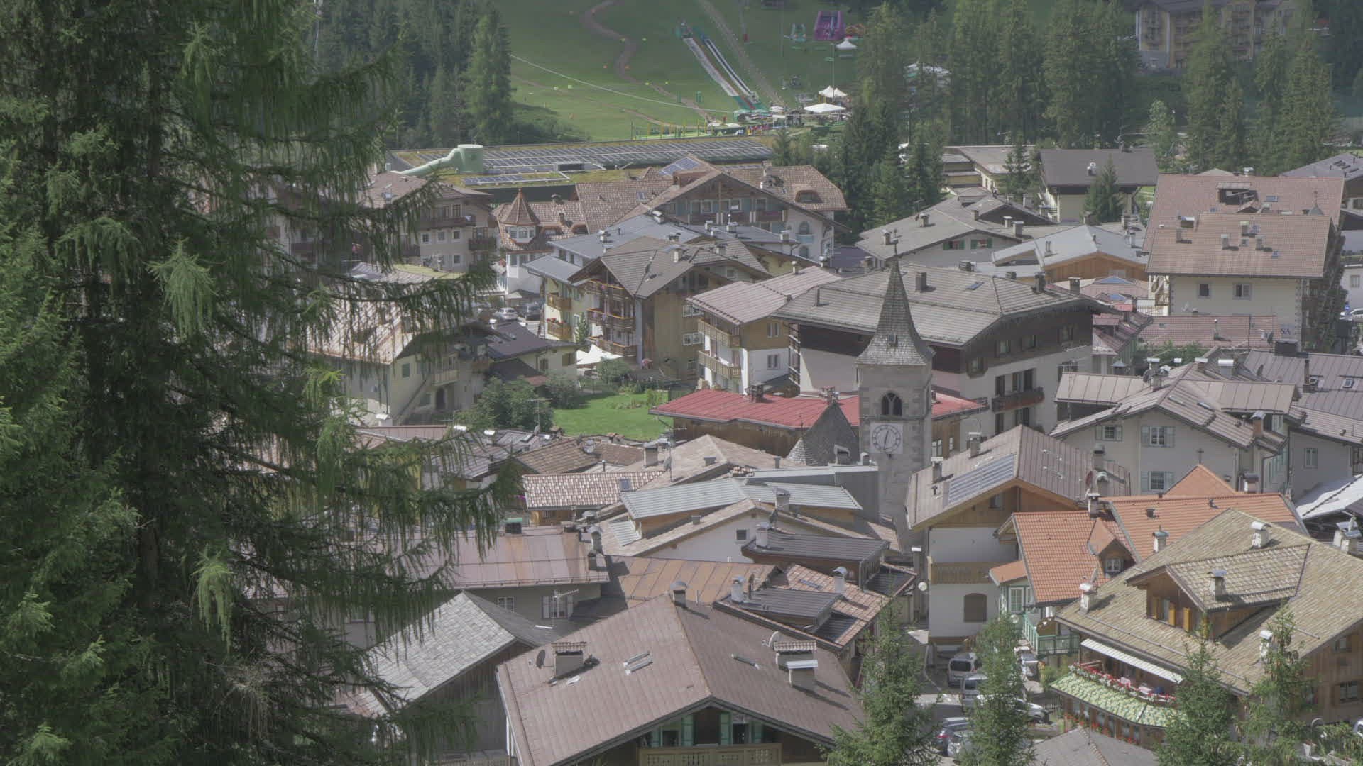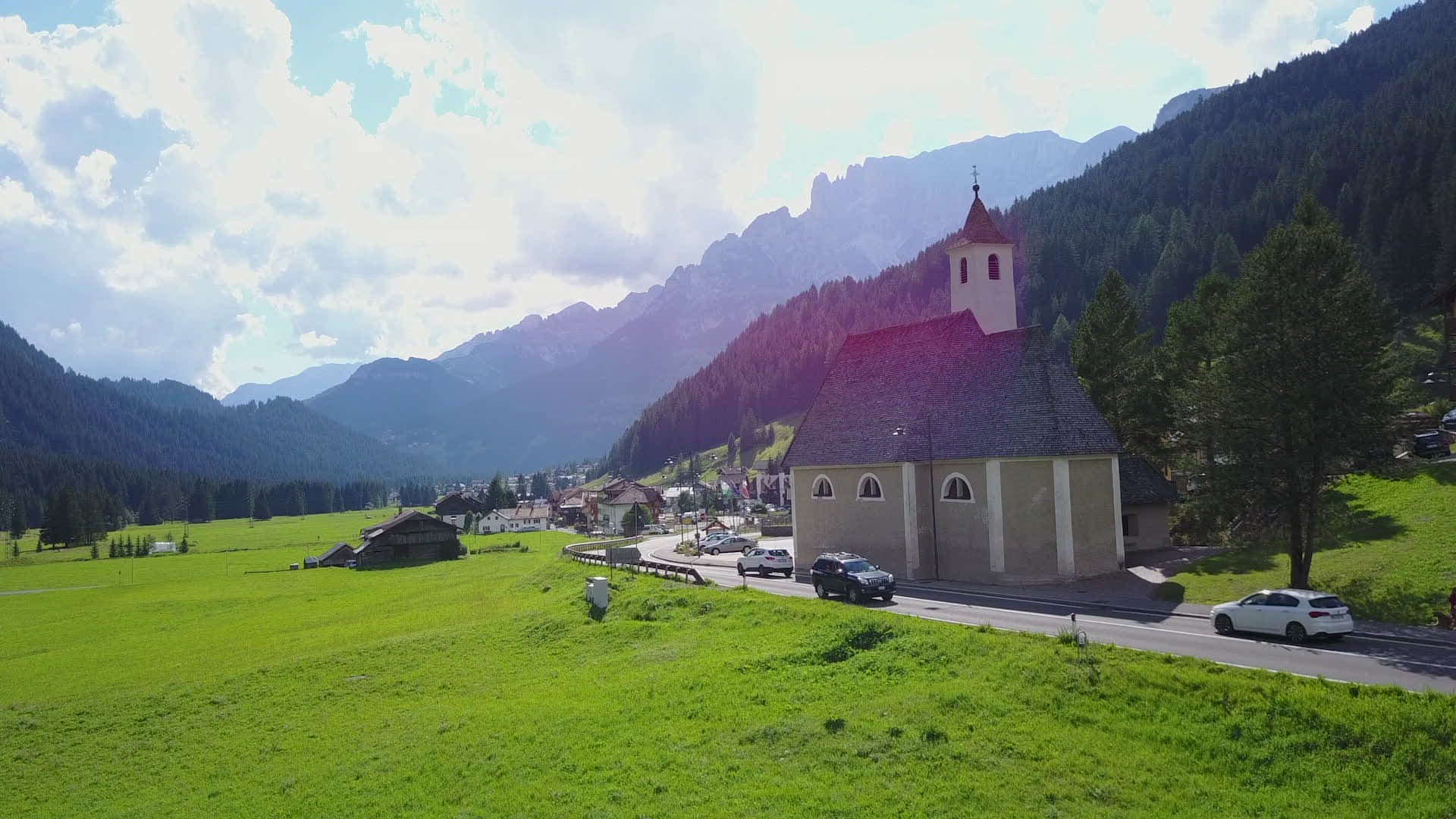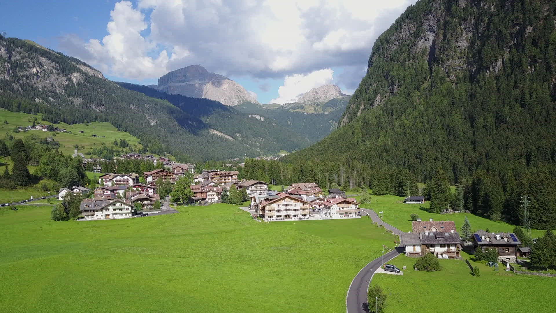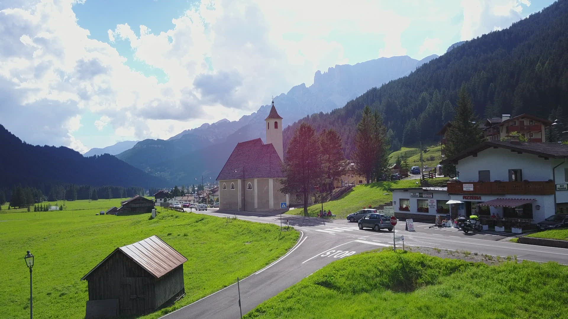 View of river and walk bridge in Canazei; Fassa Valley; Province of Trento; South Tyrol; Italian Dolomites; Italy; Europe