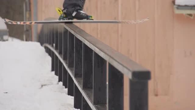 1100110 - Close Up Skier Grinds Down Rail Inside a City