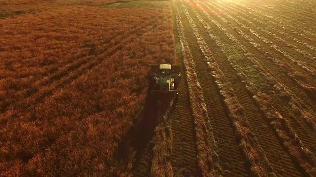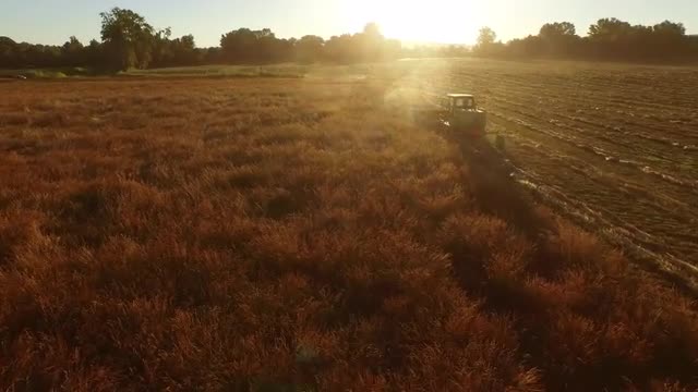 370763 - Aerial shot of combine in field at sunrise