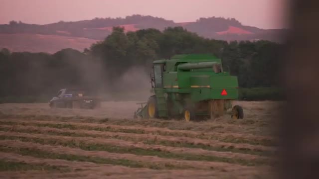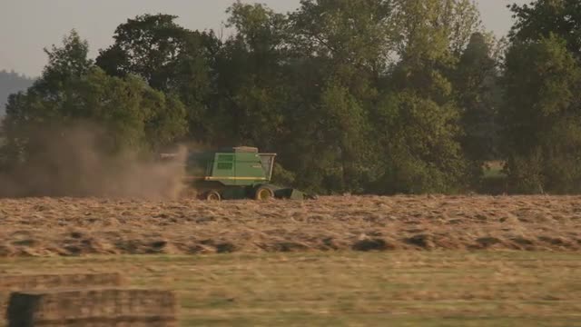 370755 - Aerial shot of combine in field at sunrise