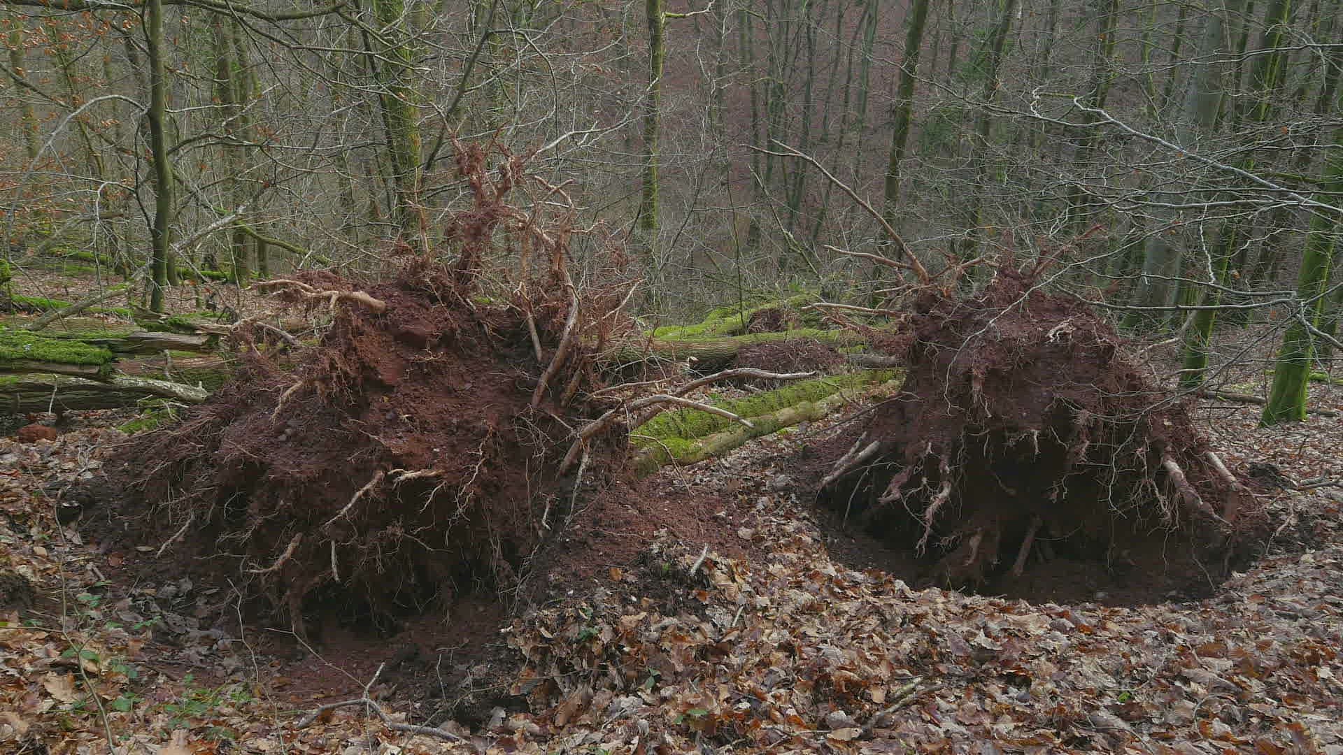 Wind breakage; uprooted trees in forest after storm