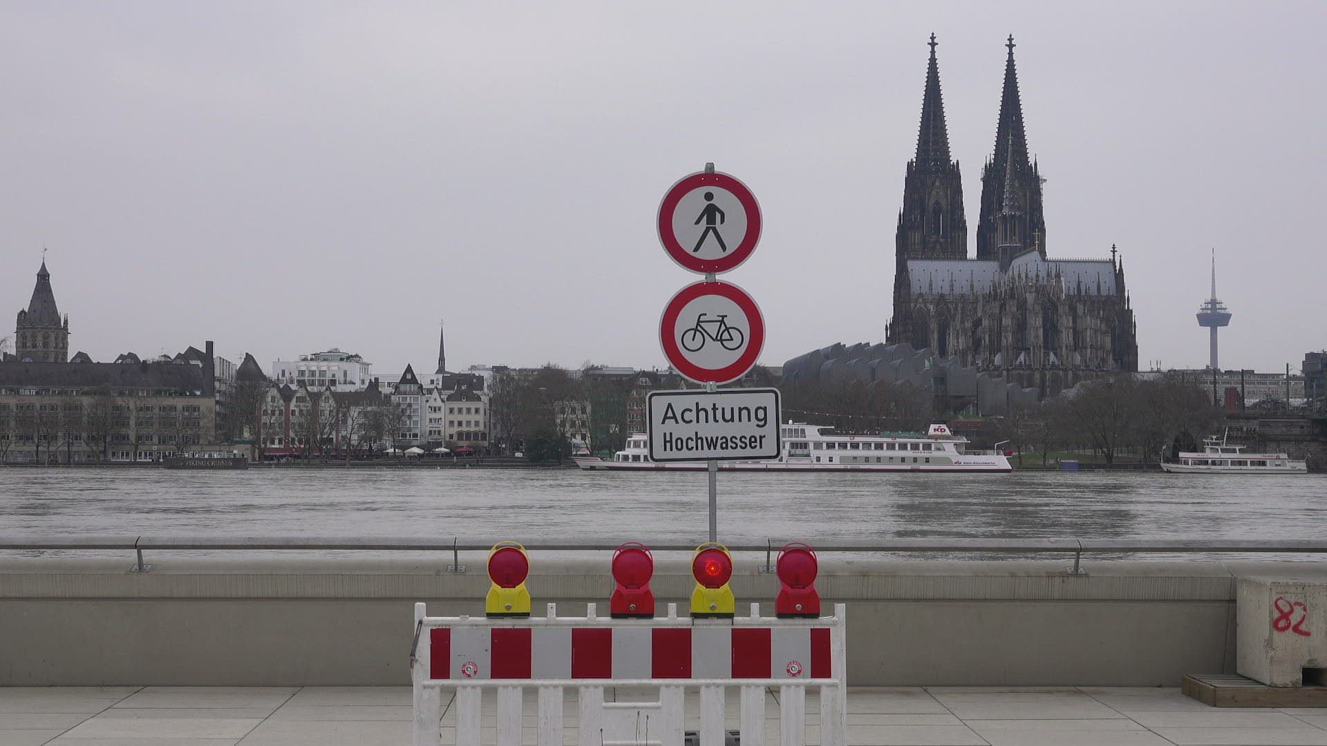 Flood of river Rhine at Deutzer Werft; Cologne; January 2018; North Rhine-Westphalia; Germany