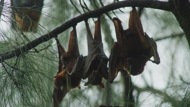 2115083 - Mating Flying Foxes Bats hanging from trees on rainy day