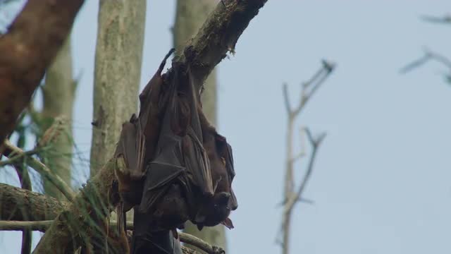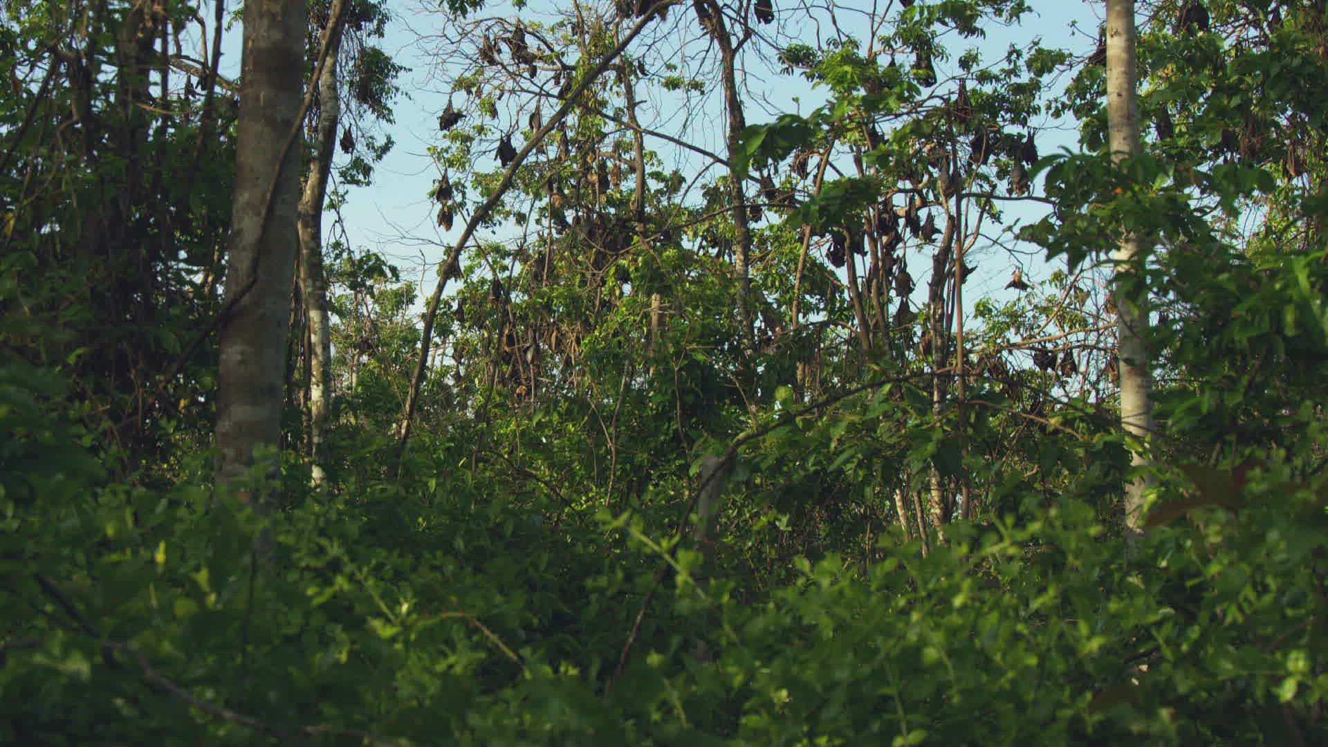 Large colony of flying fox bats hanging from tree branches