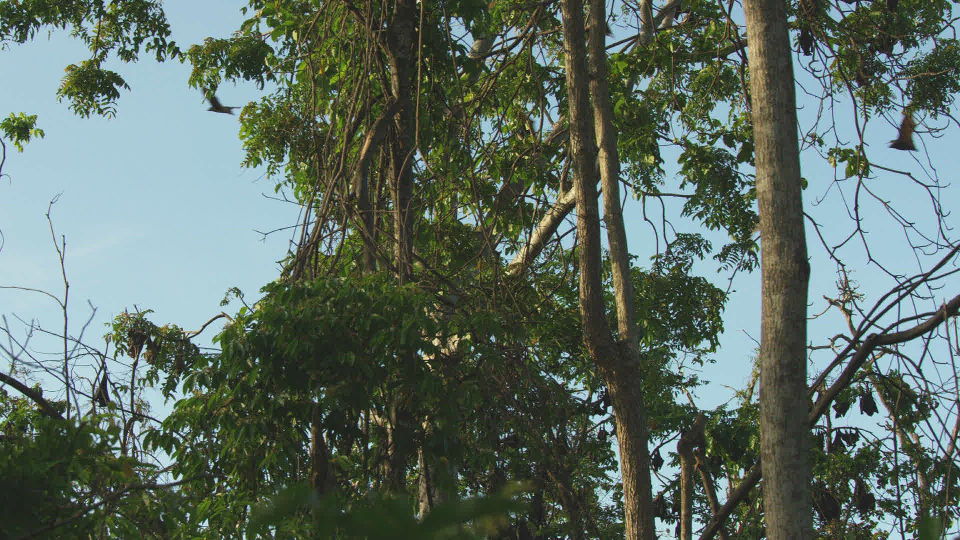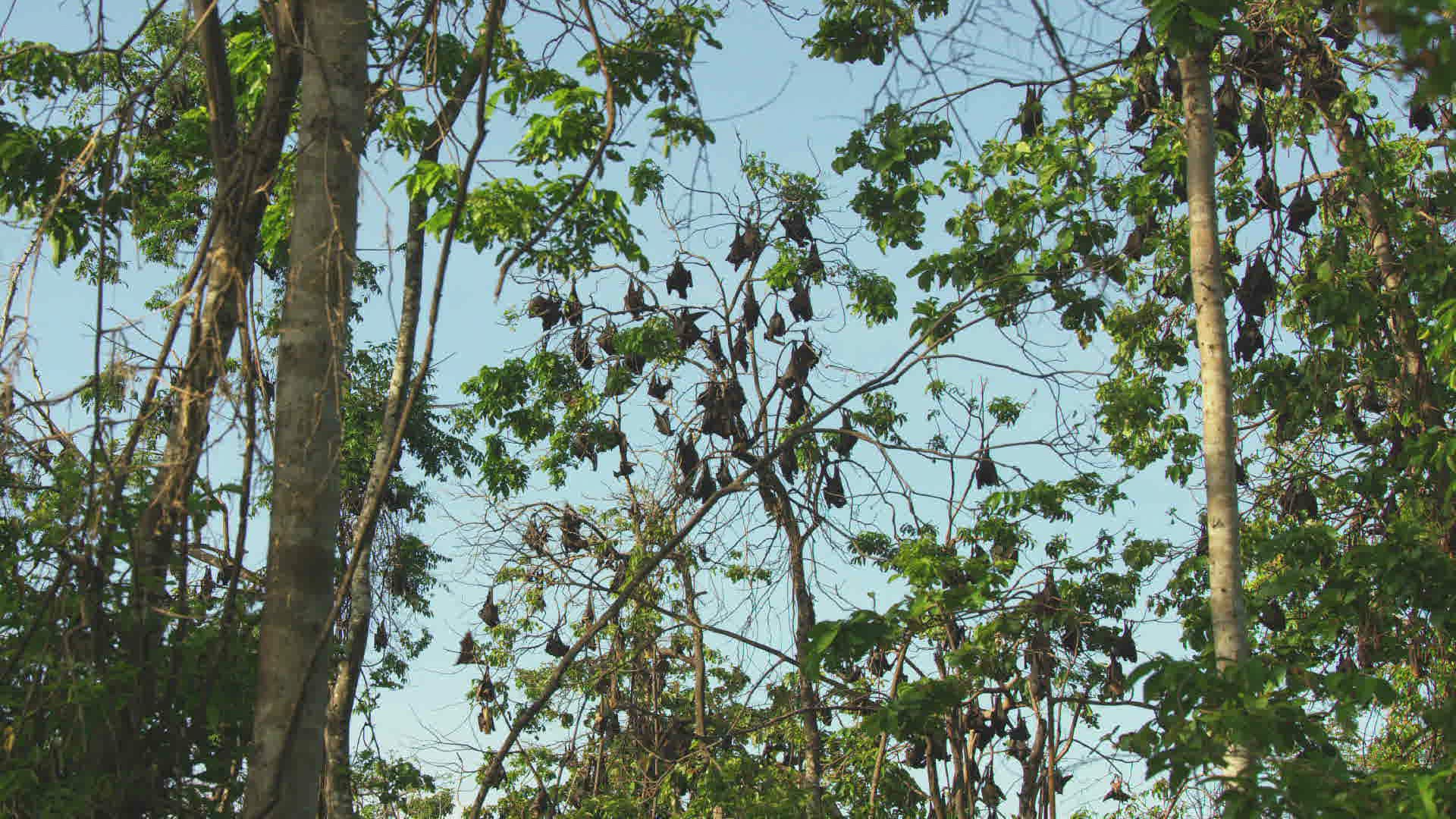 > Large colony of flying fox bats hanging from tree branches