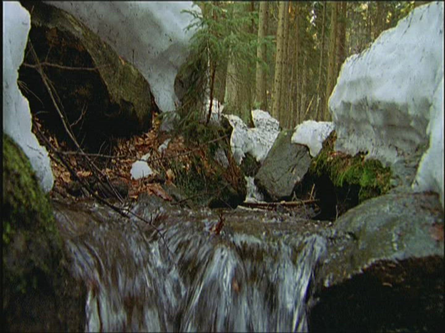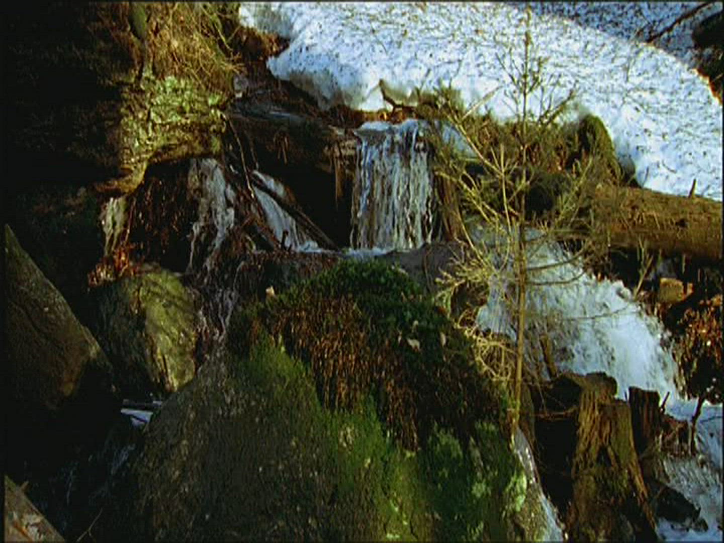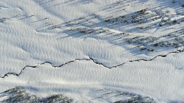 A stream illuminated by the rising sun moves through a tall bank of snow. The snow has beautiful windswept patterns.