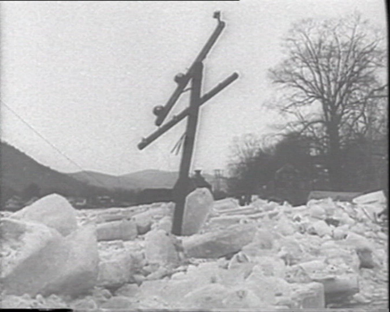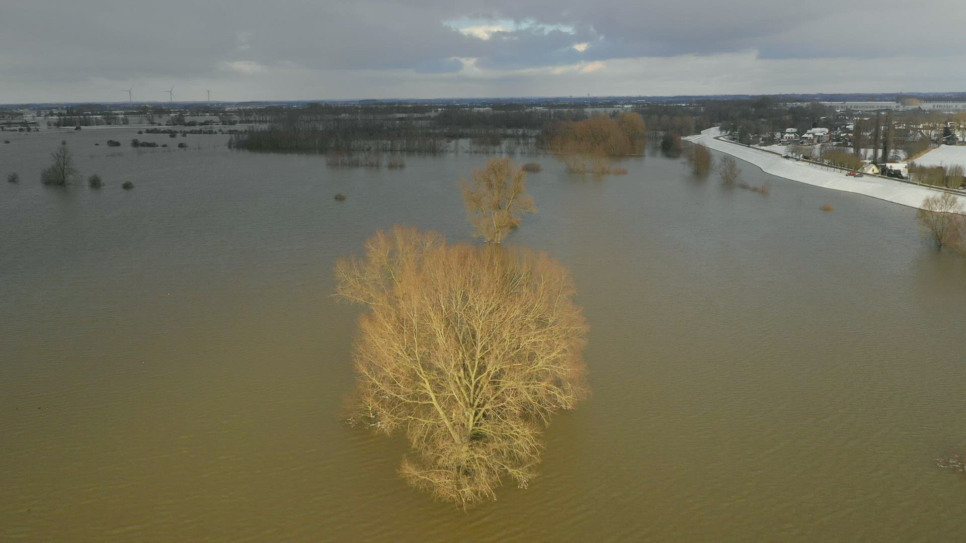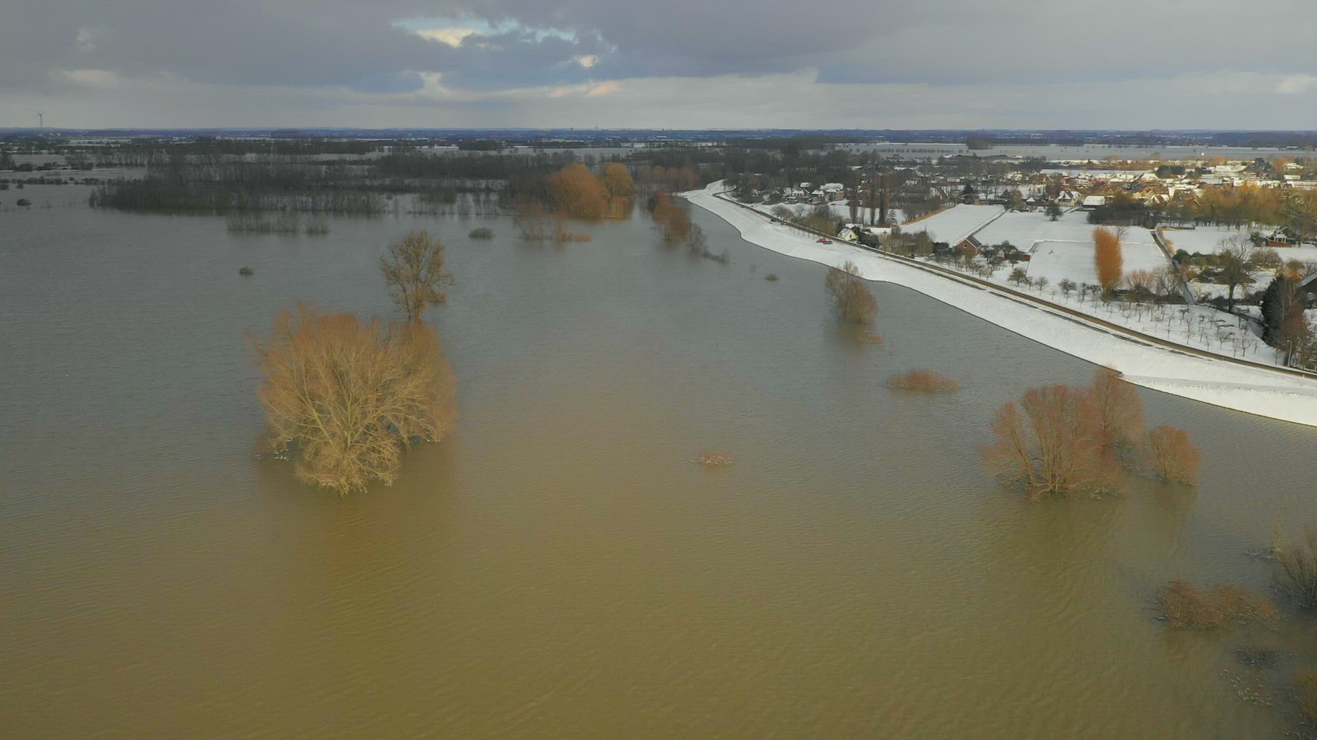AERIAL Flooded in snow covered landscape / Hurwenen, Gelderland, Netherlands