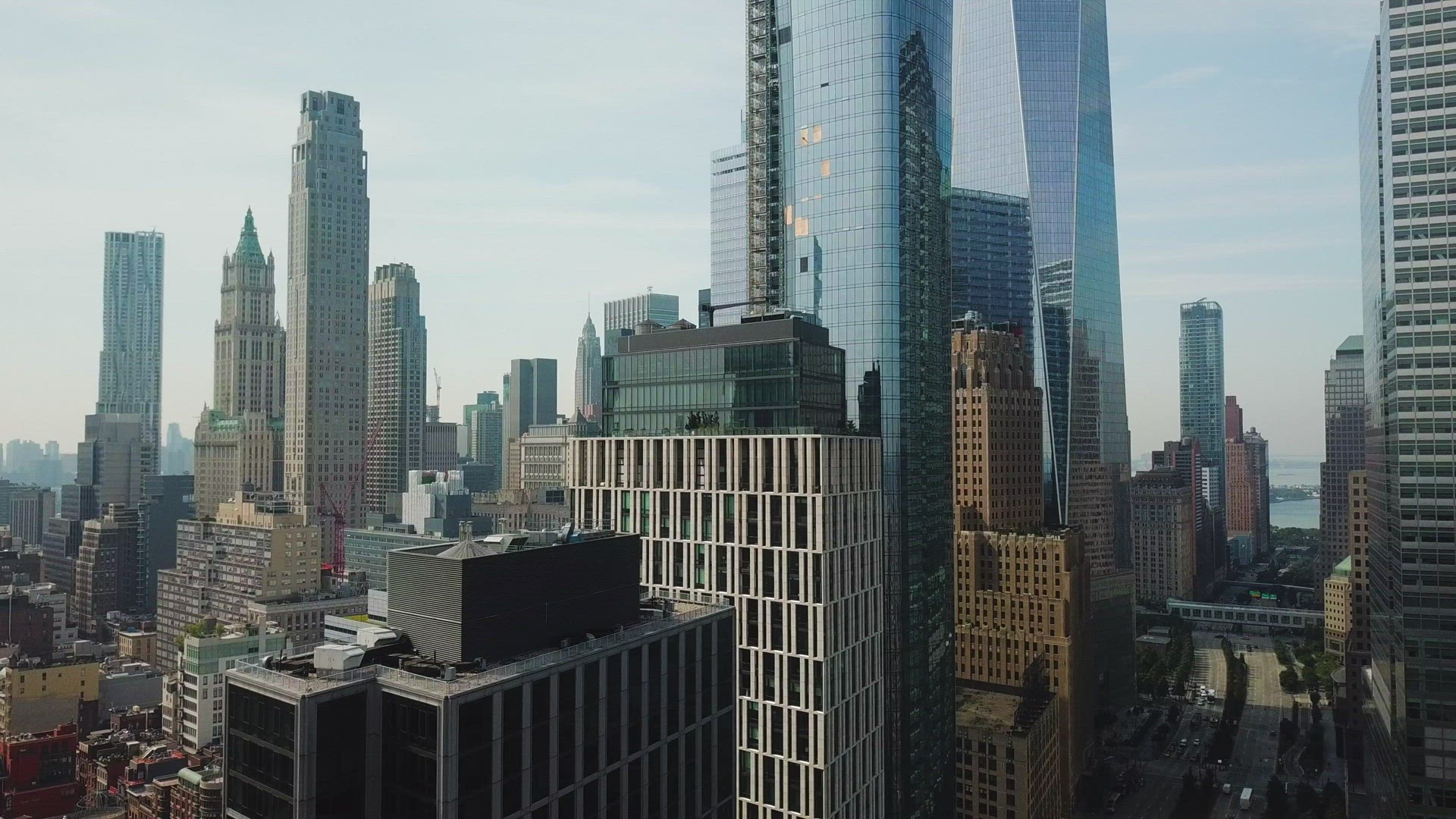 > Crane Shot of the Lower Manhattan Skyline