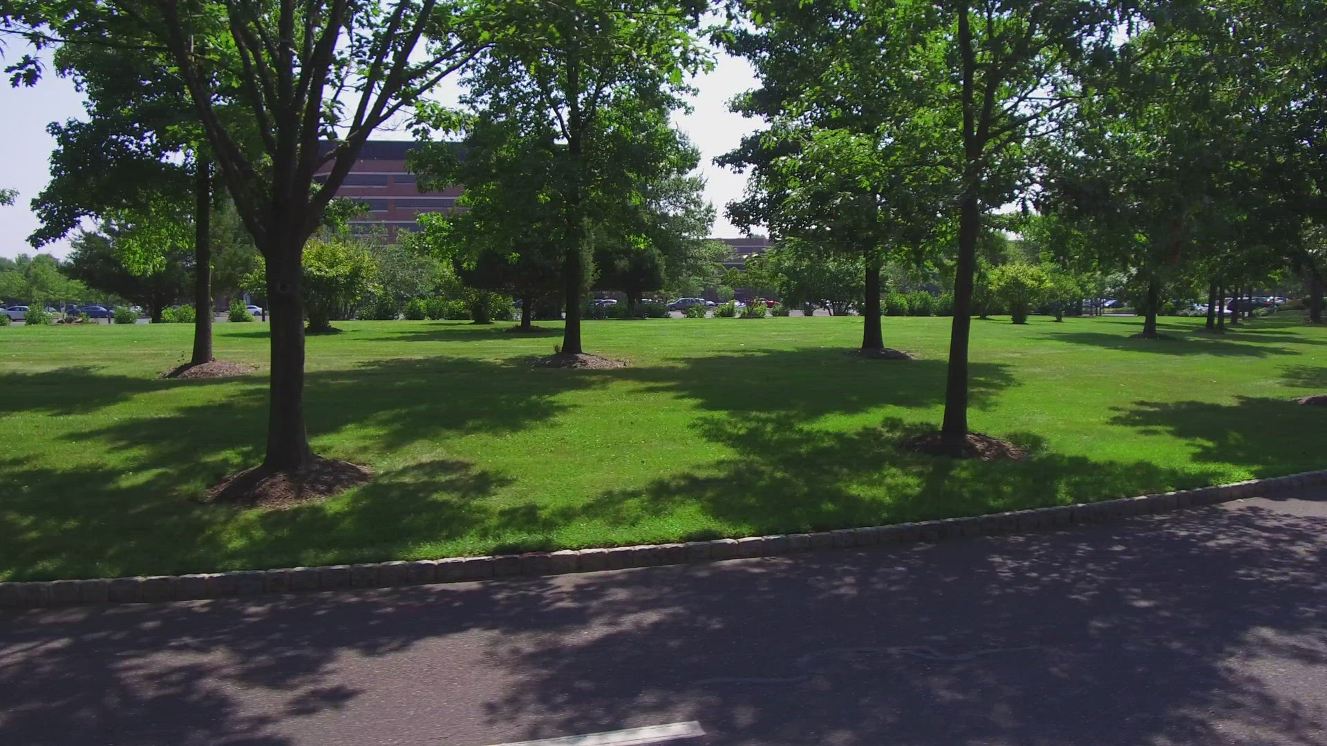 This video shows scenic aerial views of a corporate headquarters in the suburbs.