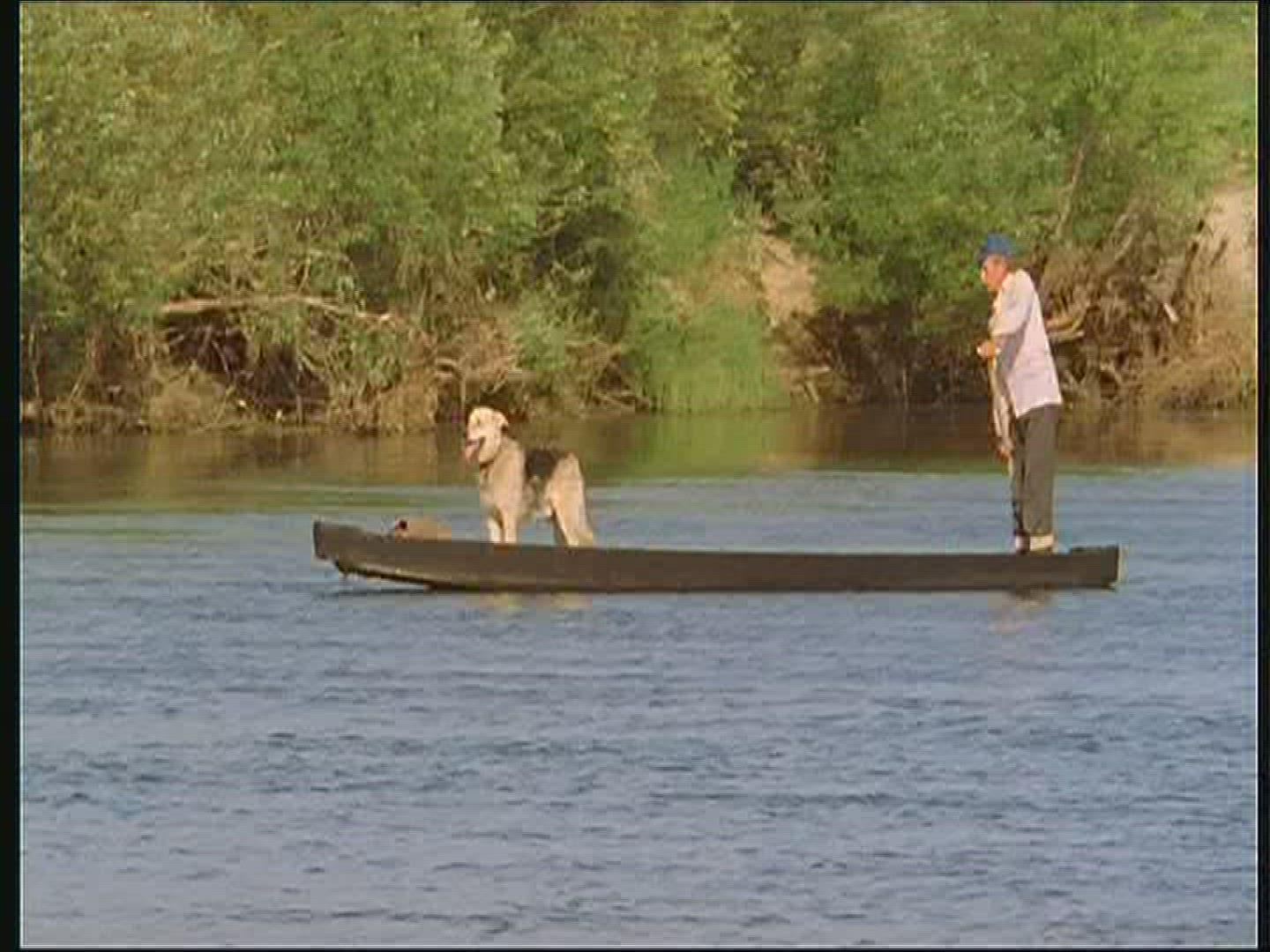 506186 - Man is Playing With White Pitbull at the River Woman is Walking Along a River People Walking With a