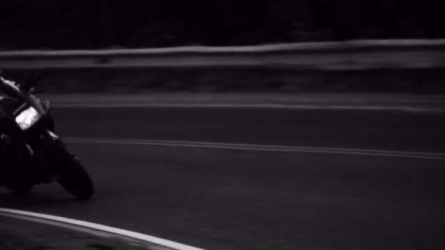 211872 - Camera follows motorbike around hilly corner.