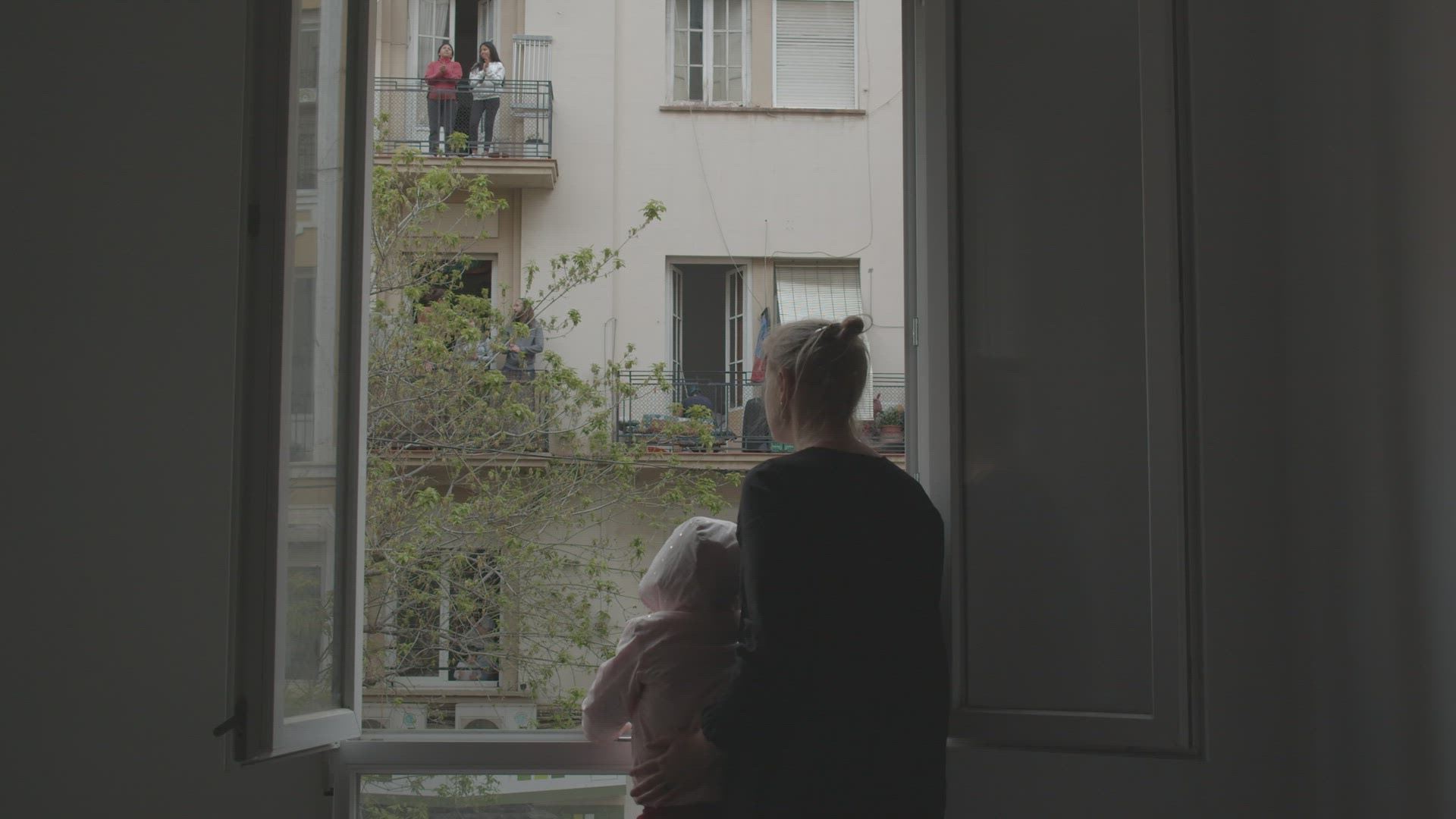 > Family in quarantine applauding to doctors during Covid-19 pandemic