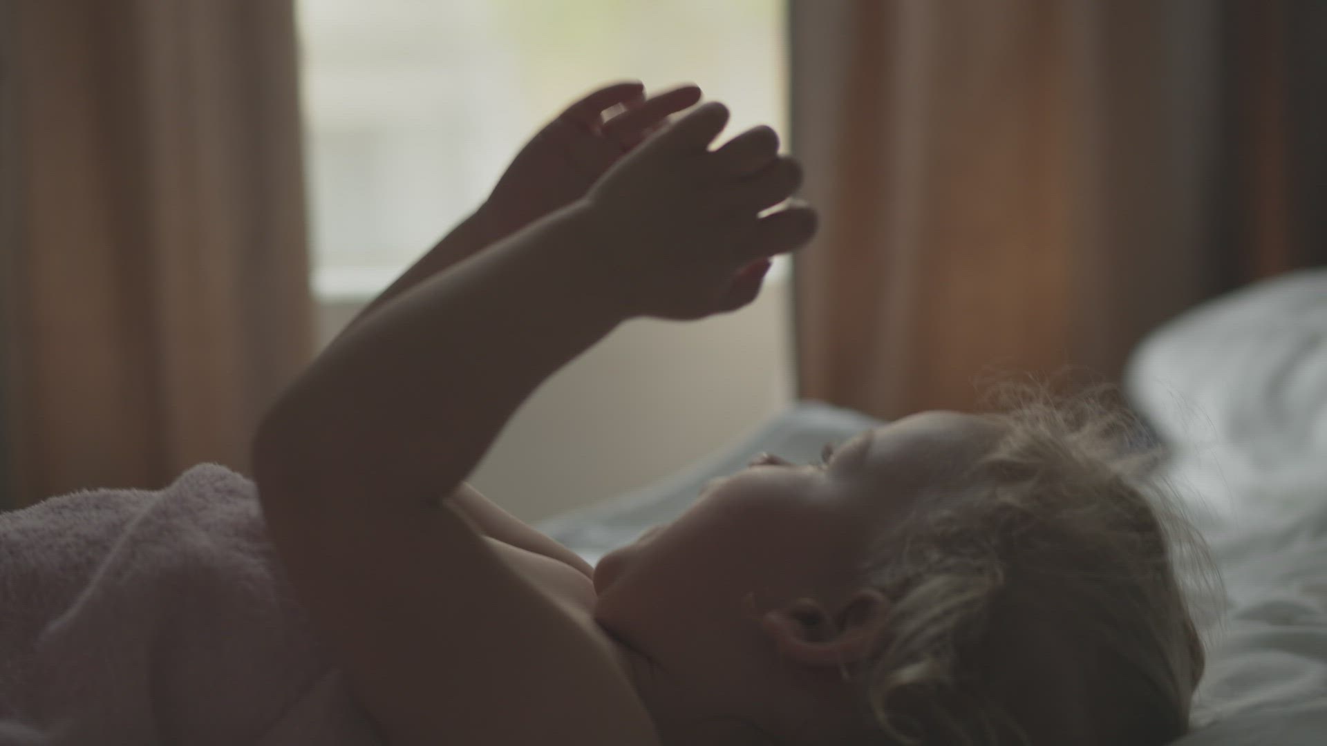 Toddler girl is staying in bed and rubbing face after waking up the morning. She does not want to get up