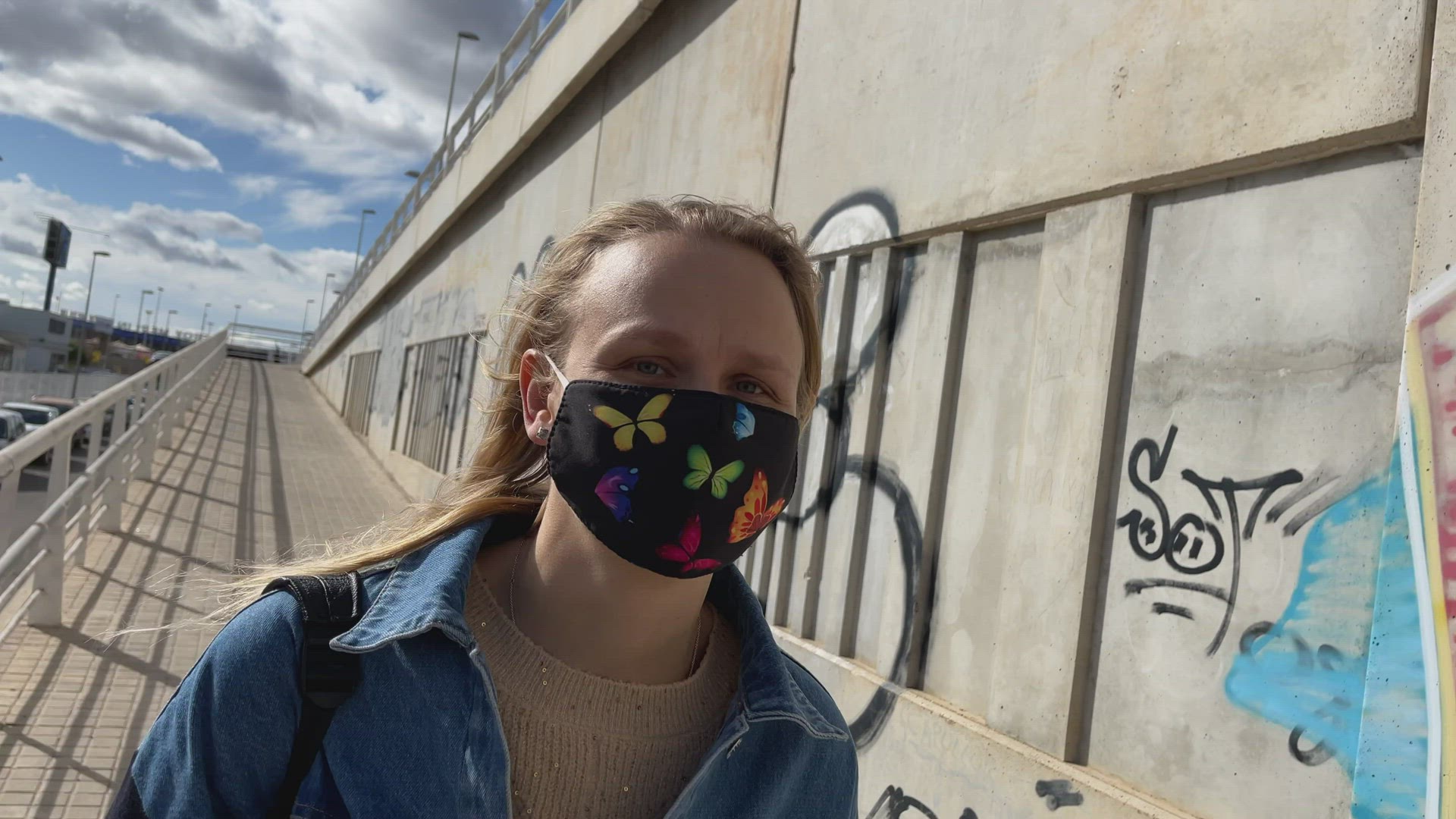 VALENCIA, SPAIN - FEBRUARY 13, 2021: Blonde woman in medical mask walking in the city district with many graffiti walls. Urban portrait during the times of COVID-19