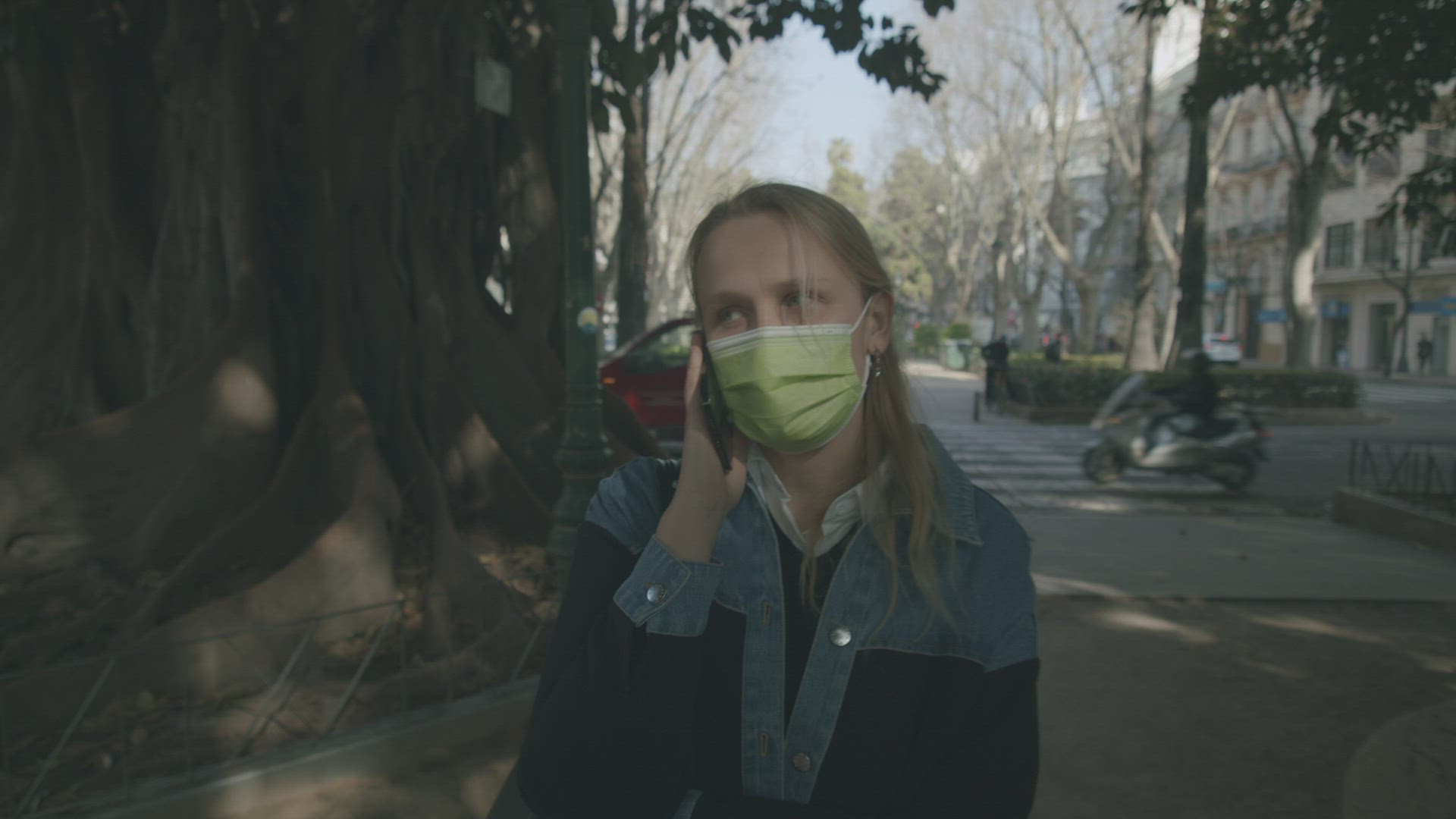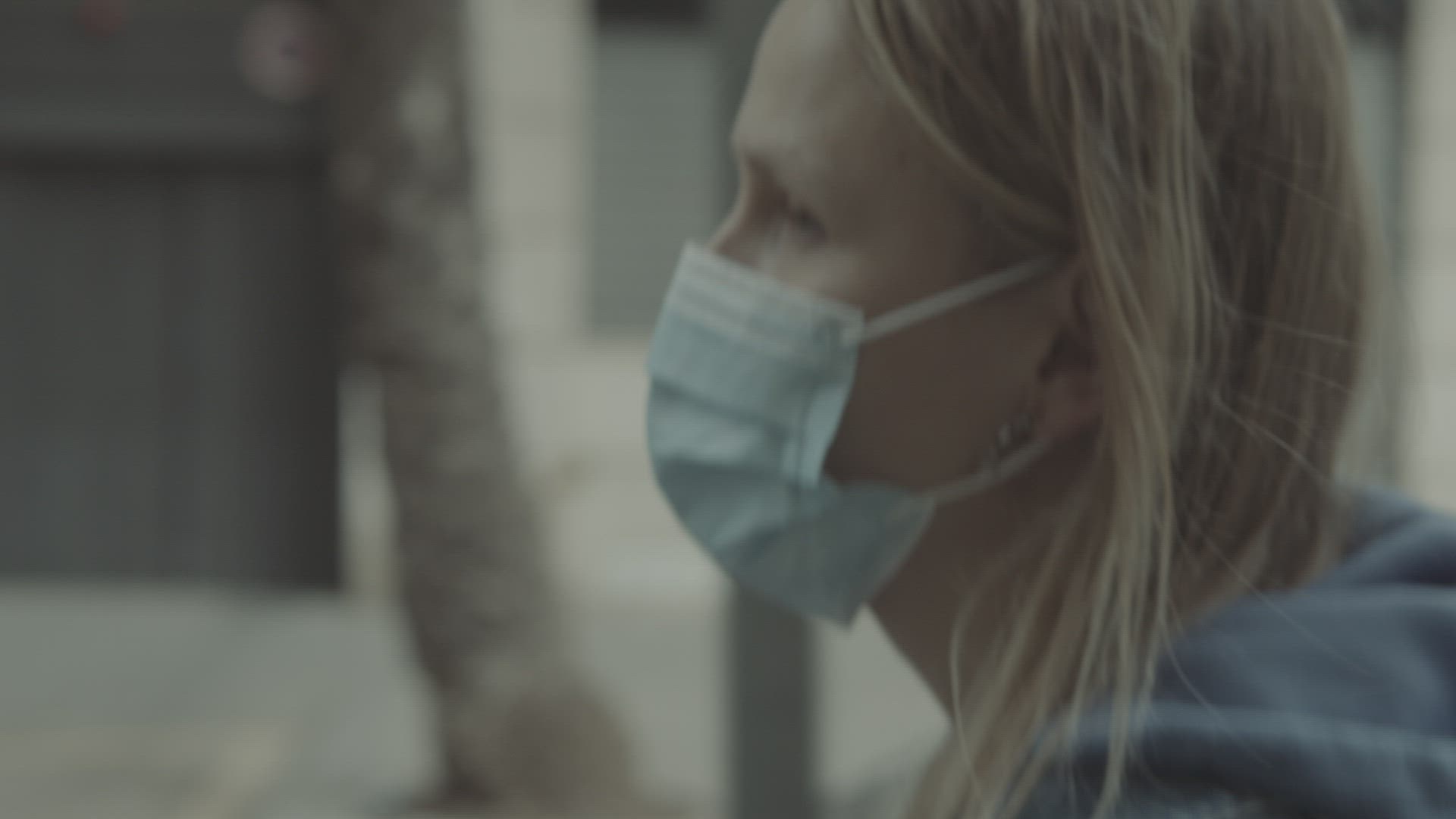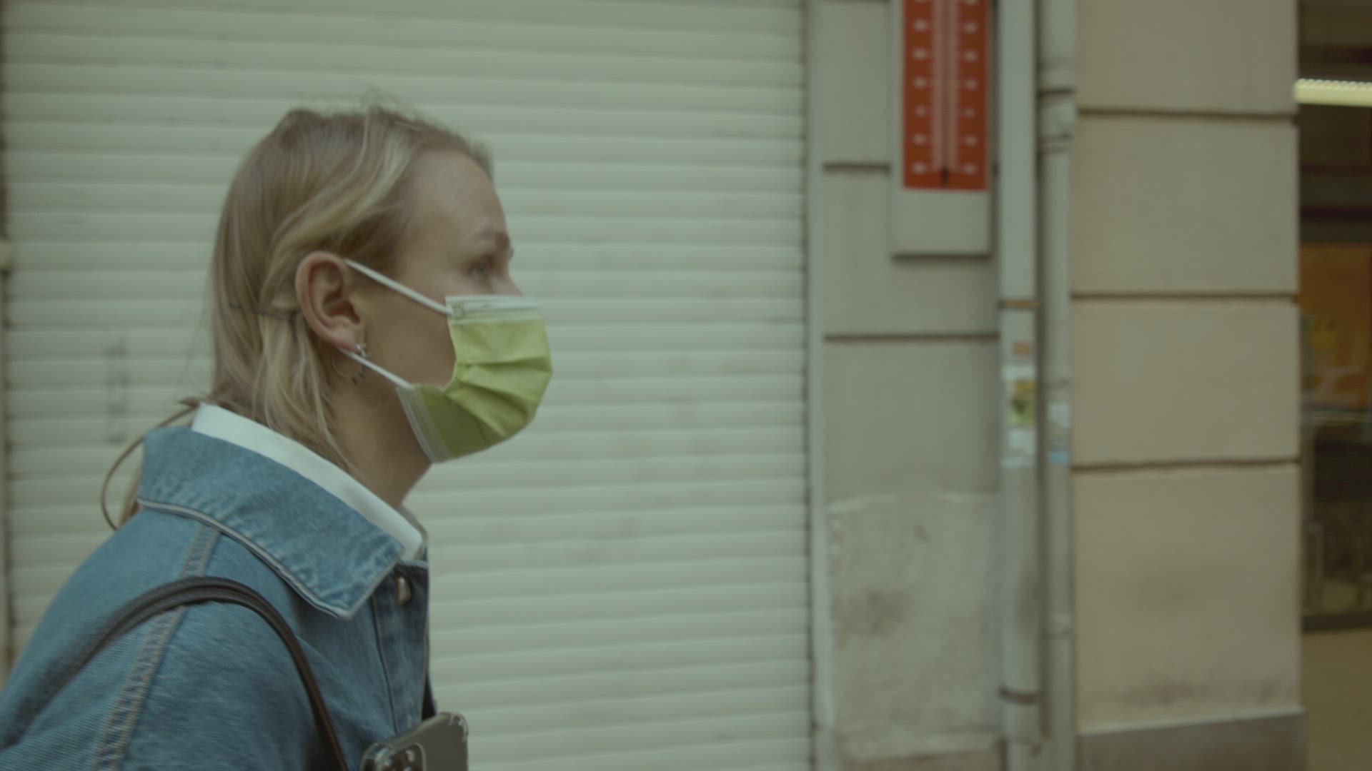 Close-up shot of woman putting on the mask and leaving the apartment. COVID-19 restrictions, people following the rules and take care of their health
