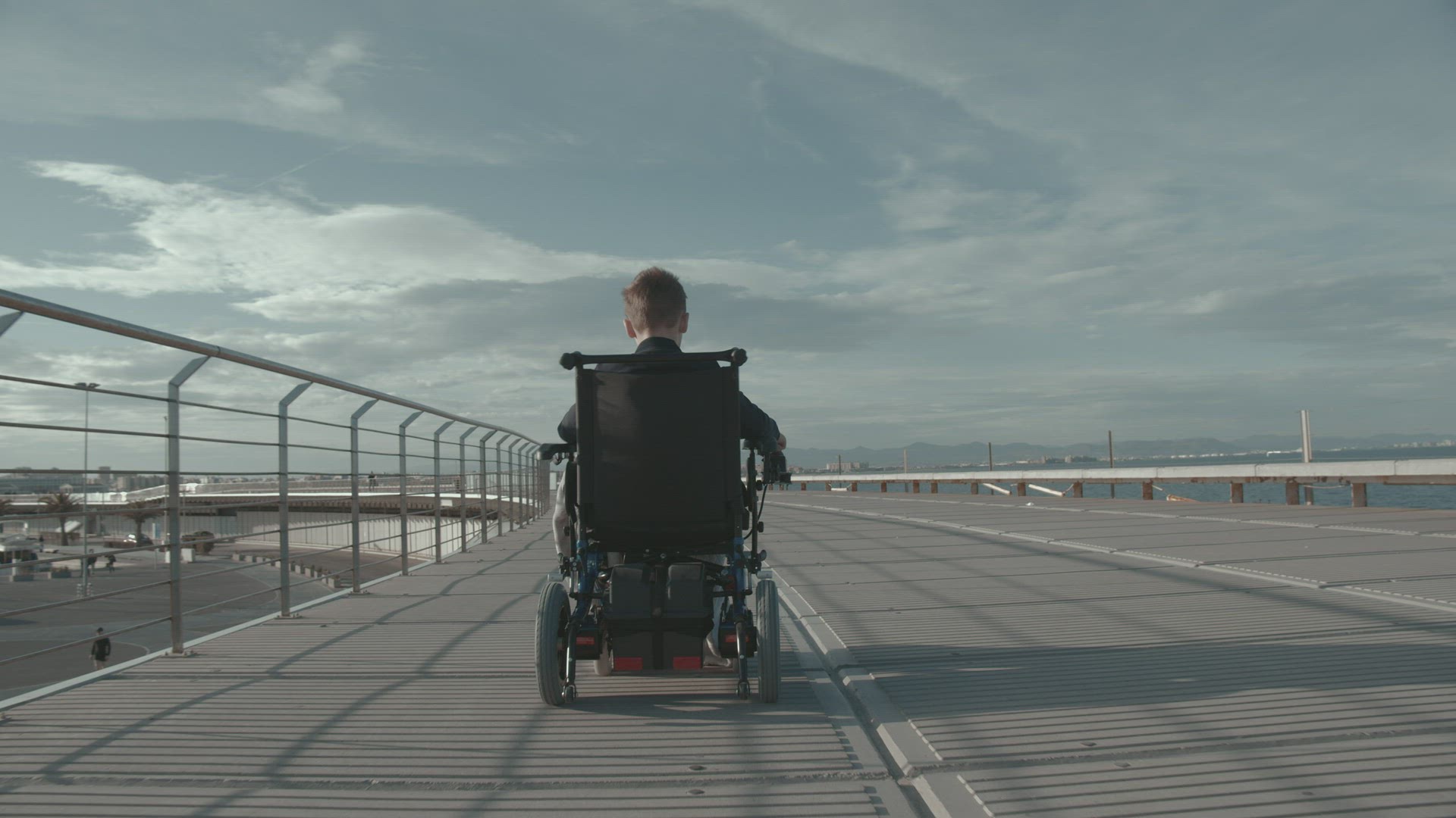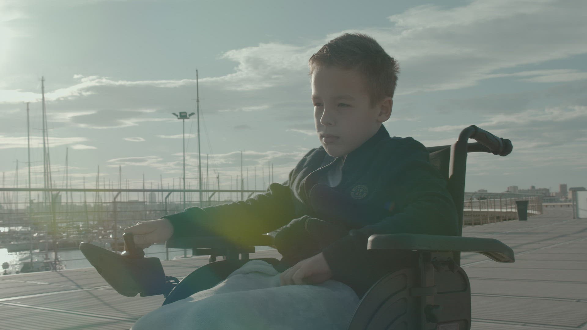 > Kid in wheelchair is curious about the chimpanzees in the zoo