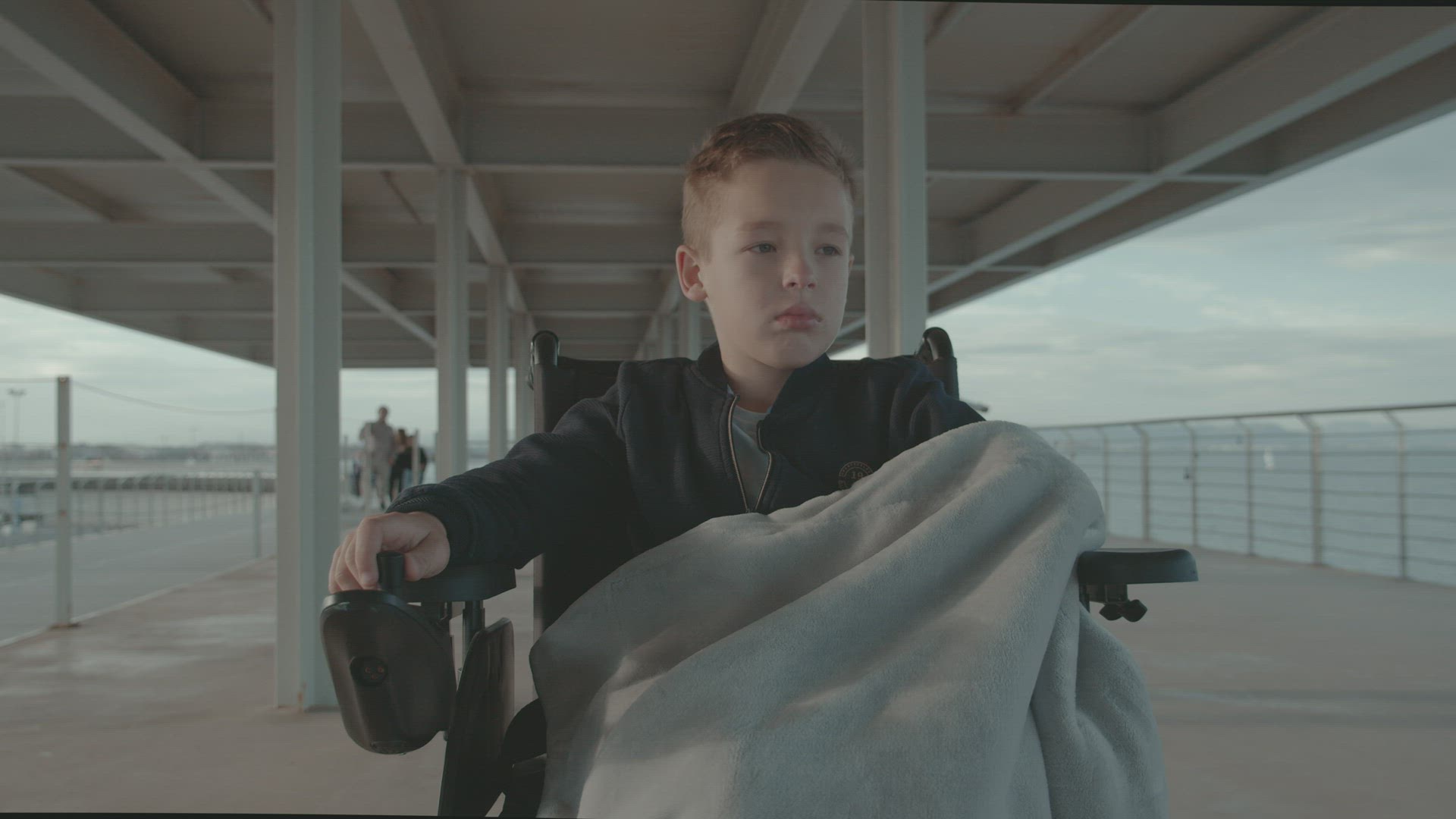 Kid in wheelchair is curious about the chimpanzees in the zoo