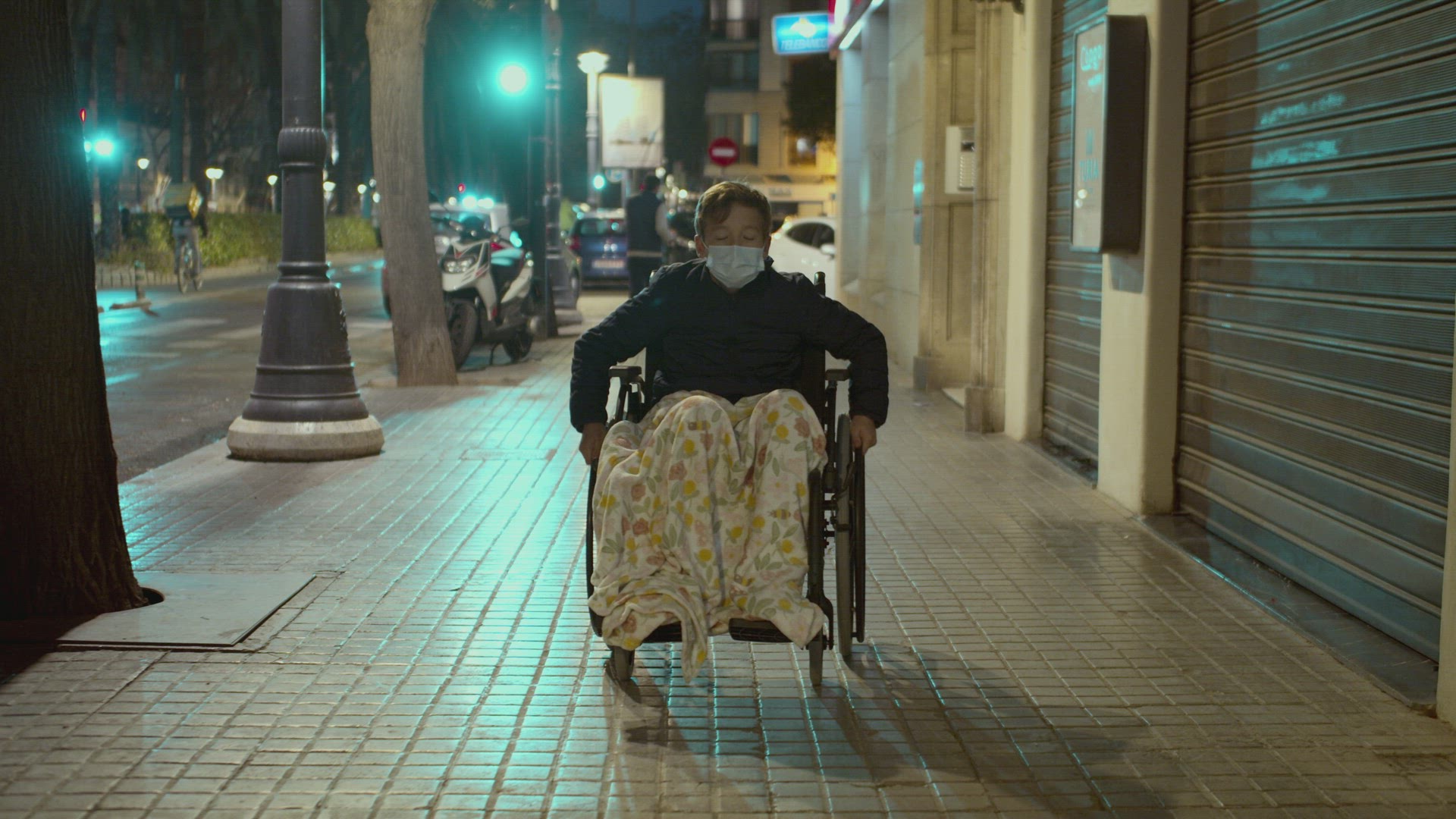 A child in wheelchair visiting the zoo and being attracted with the chimpanzees family of mother and child cuddling together when sleeping. Boy wearing mask as coronavirus precaution