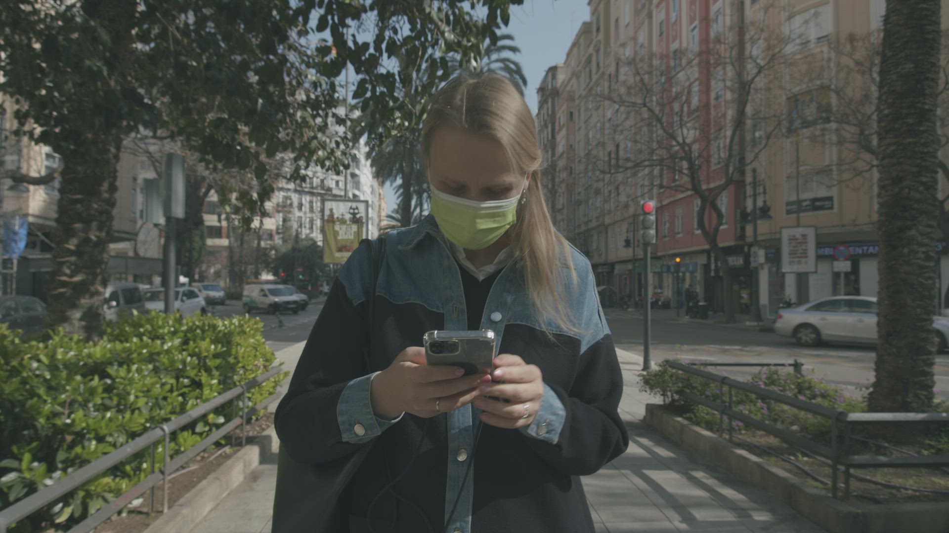 Close-up shot of a female hand typing on cellphone in subway with following view of a woman face in medical mask. COVID19 precautions