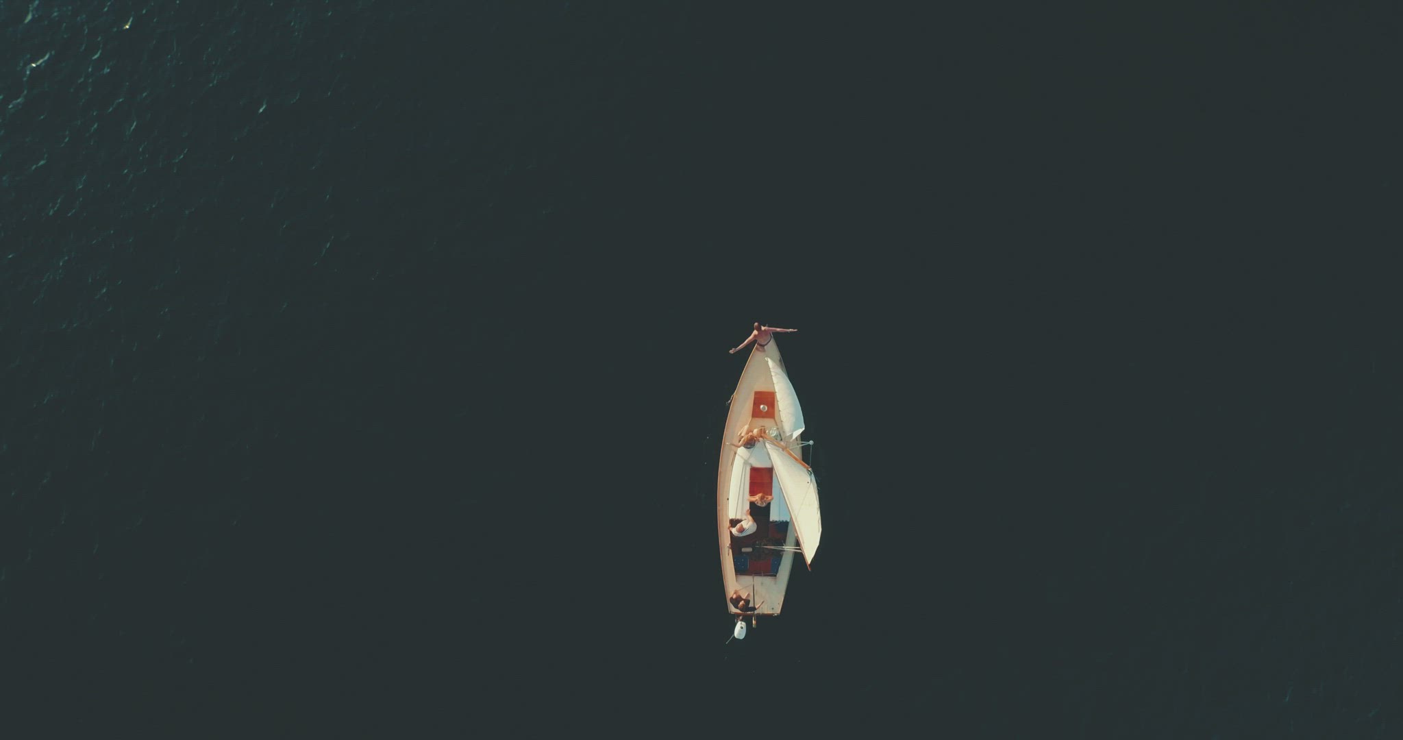 > guy jumping of a sailboat topshot aerial 4k