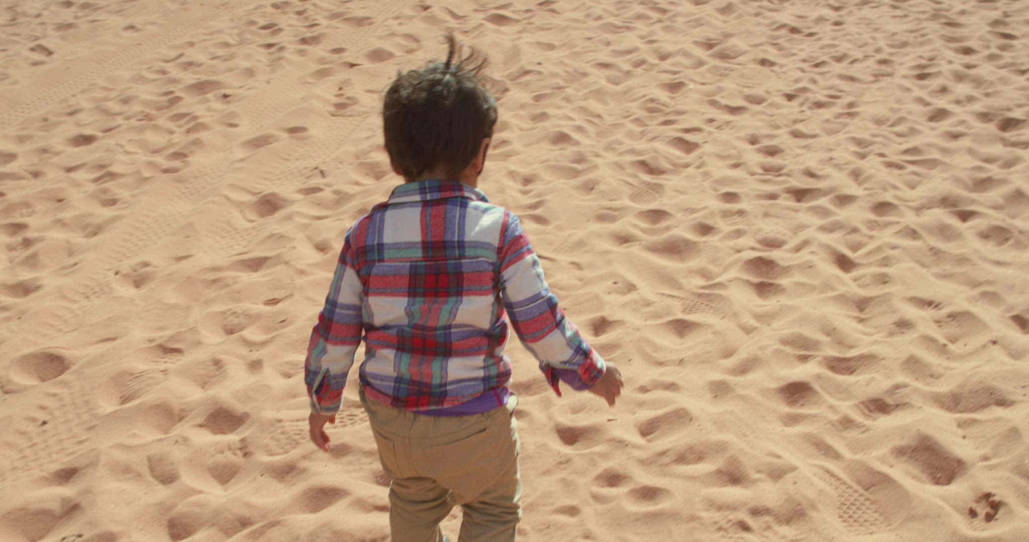 > Rear view of family walking in Wadi Rum Desert, Jordan