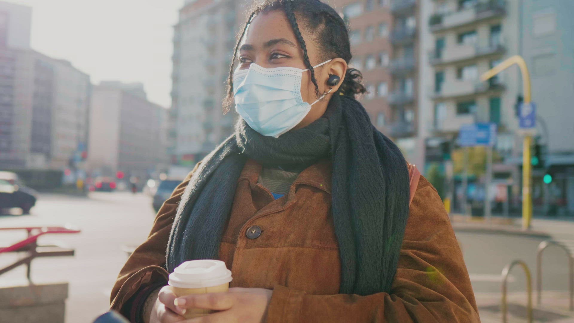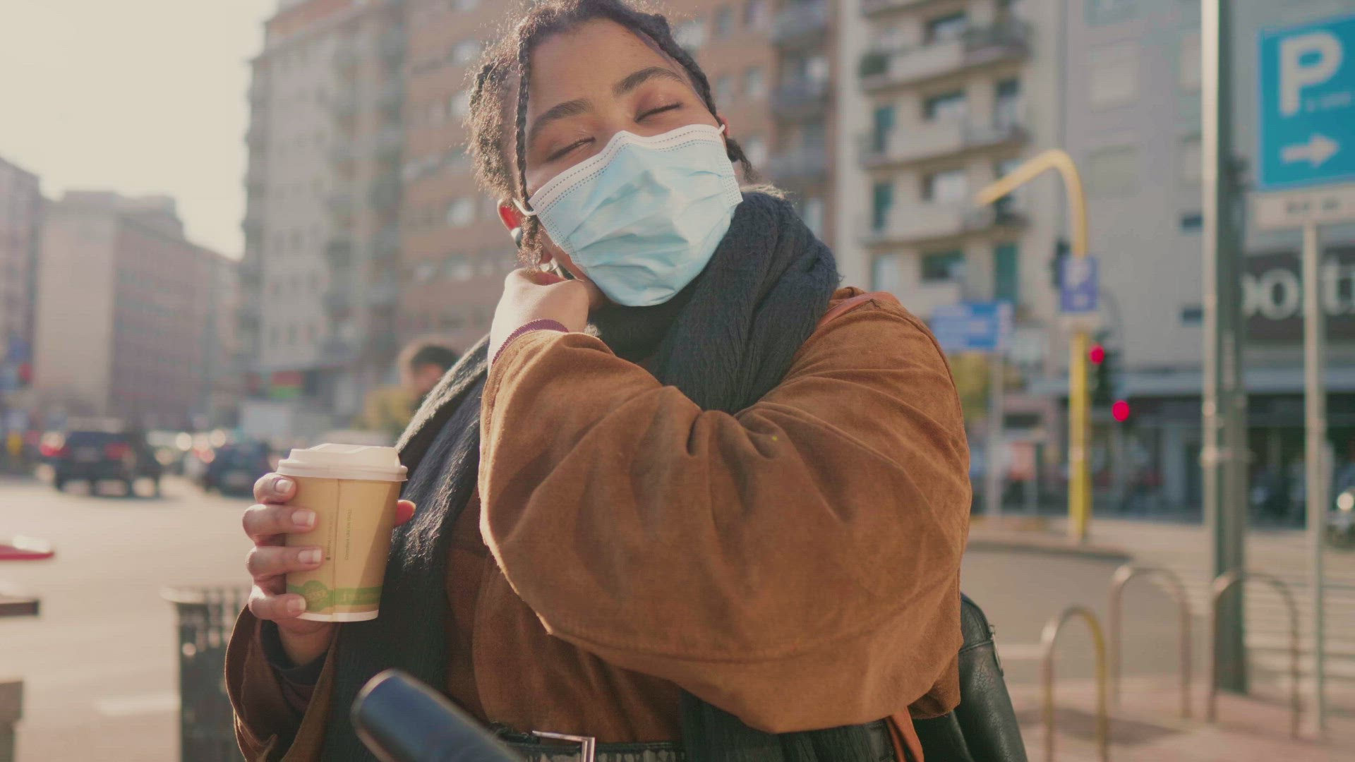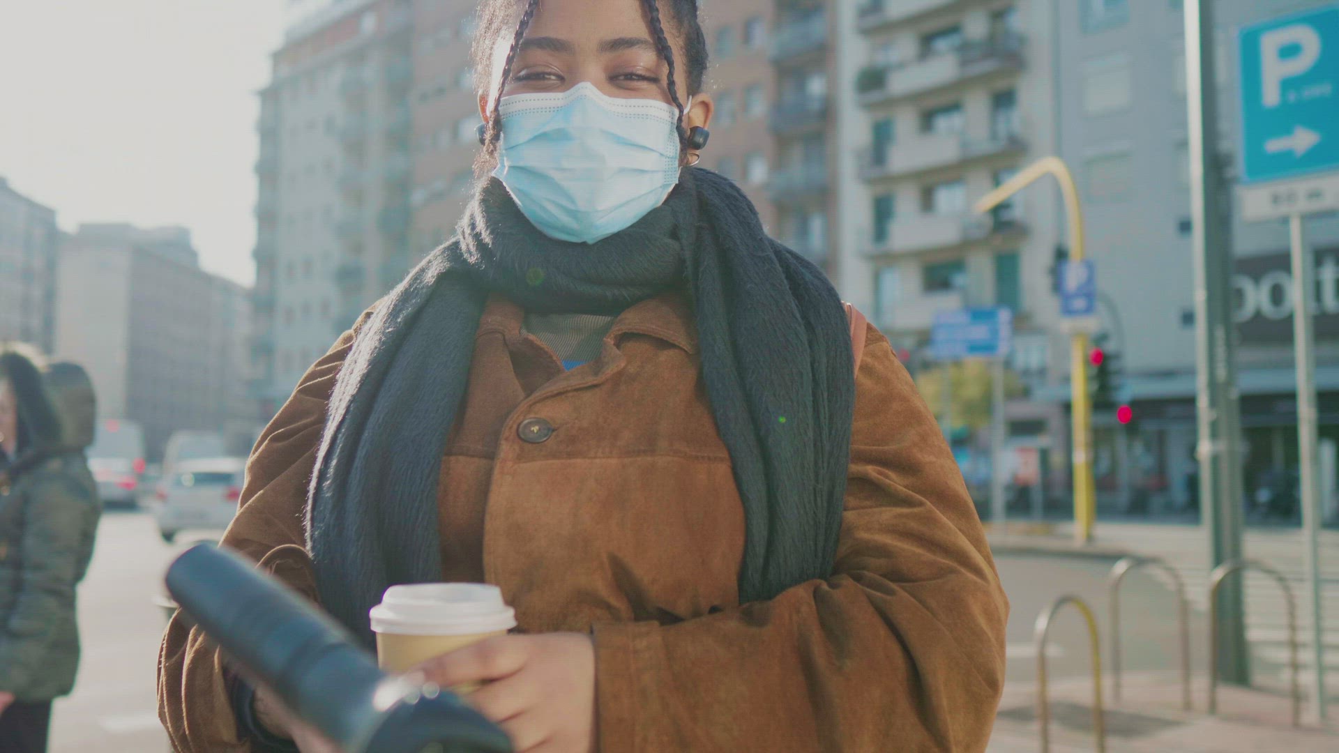 > Young woman in face mask waking on street, Italy