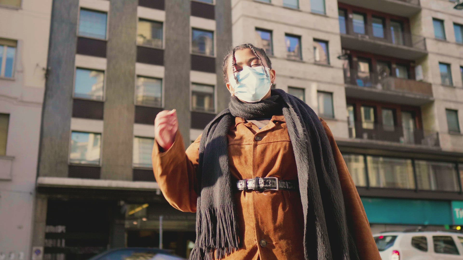 Young woman in face mask waking on street, Italy