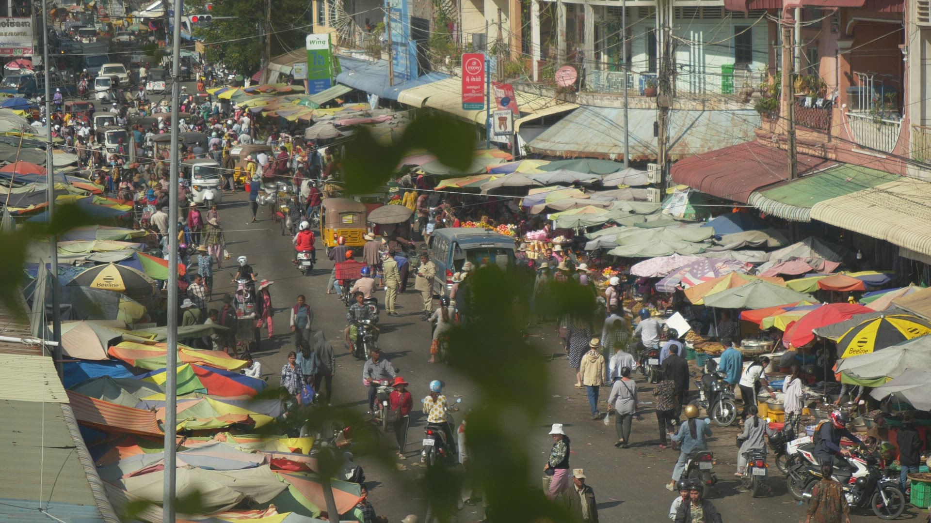 > Street market in Phnom Penh from high angle