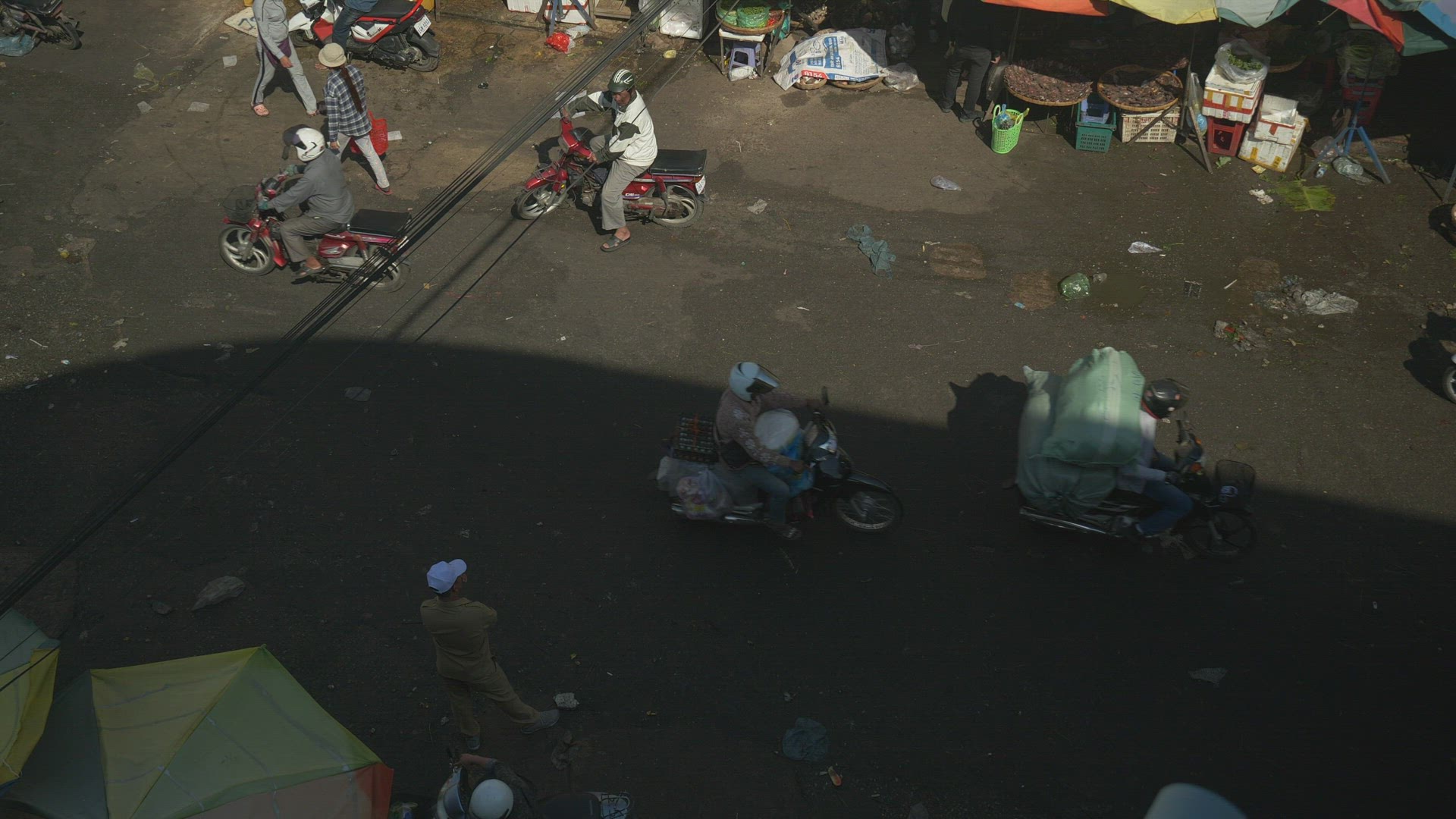 > Scooters drive through street market, dolly