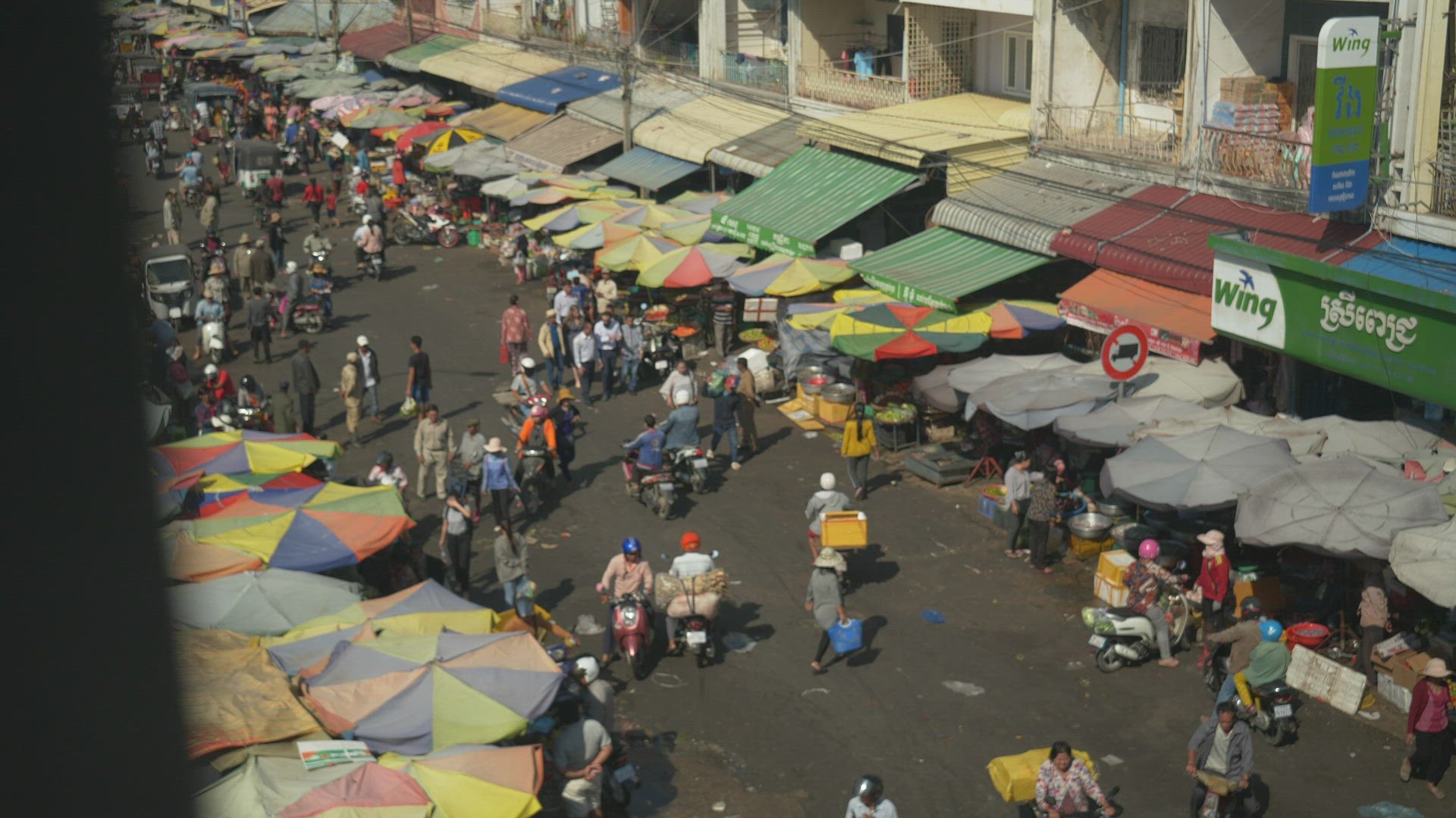 Busy street market in Phnom Penh, wide dolly