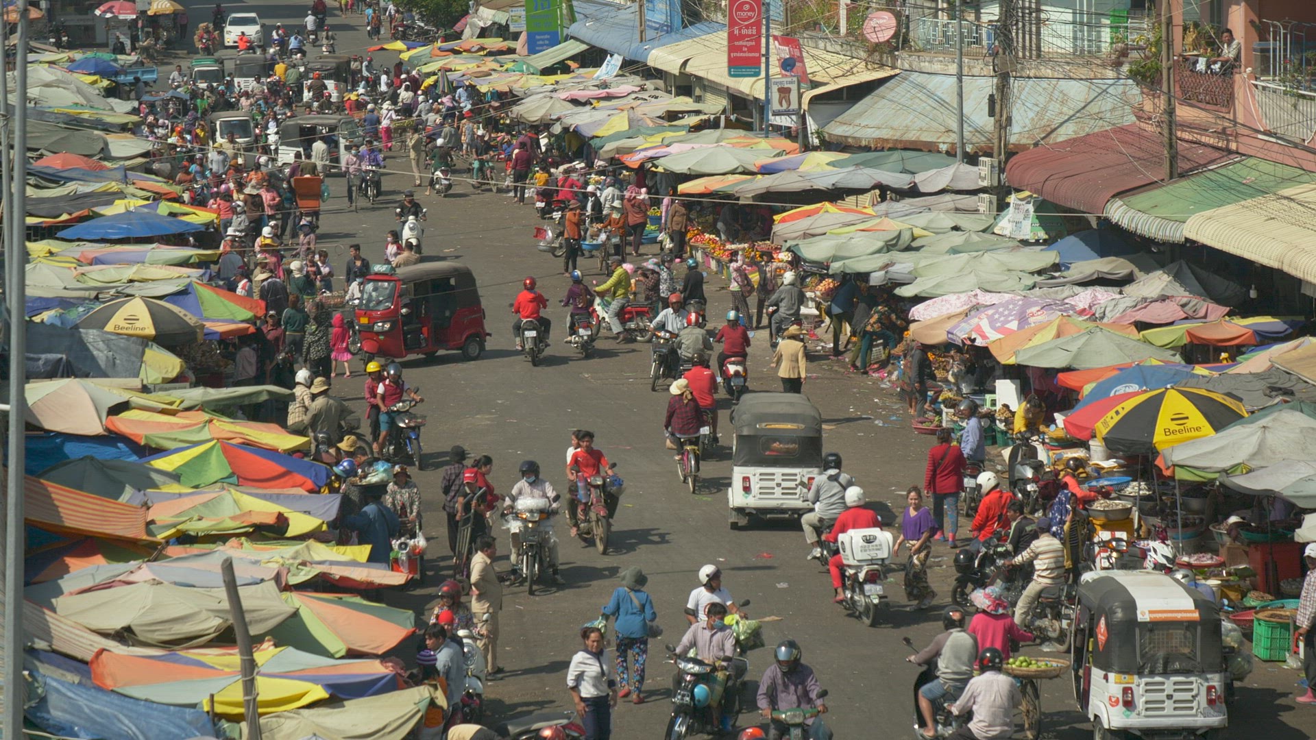 > Street market in Phnom Penh, static high angle