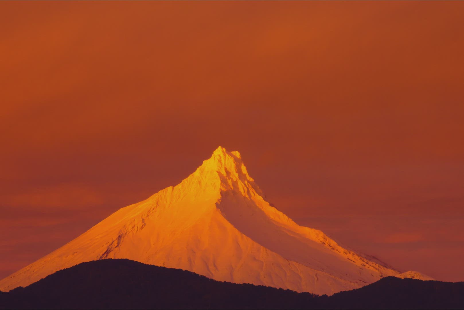 Time-lapse colors of the sun setting over the Osorno Volcano with snow covering the hills, golden sunset.