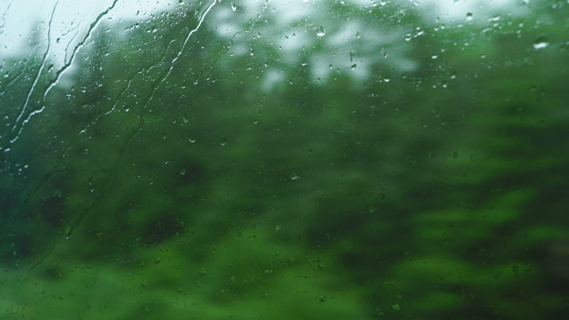 pov through wet train window - riding through rainy landscape