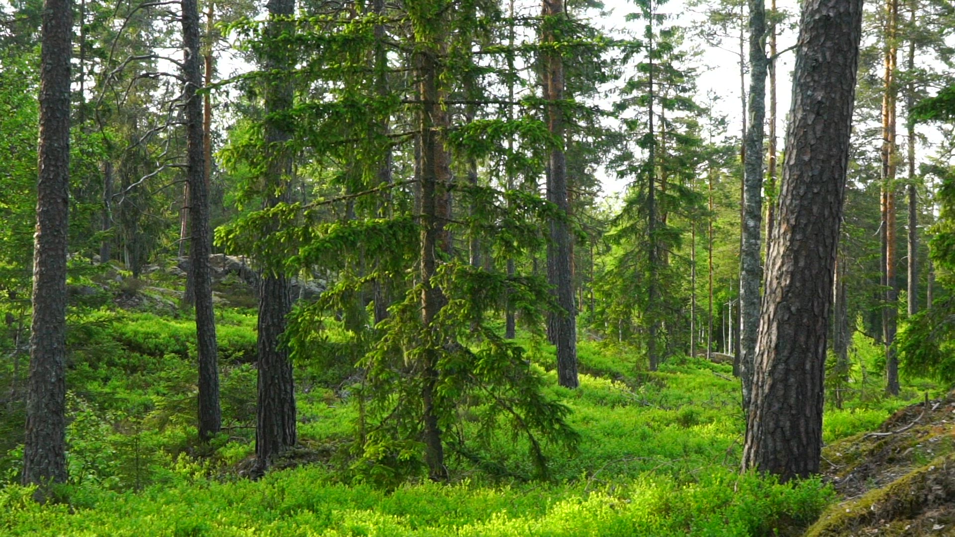 > drone shot - pov through swedish forest