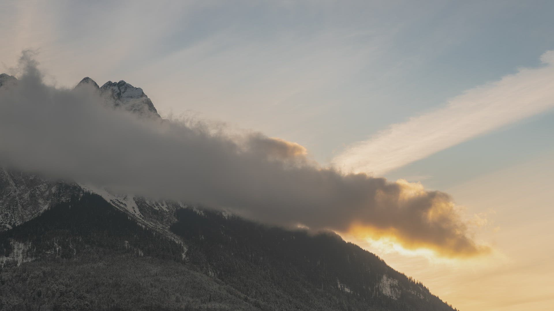 Timelapse of a cloud bank rolling past a mountain during sunset with the underside of the cloud lighting up.