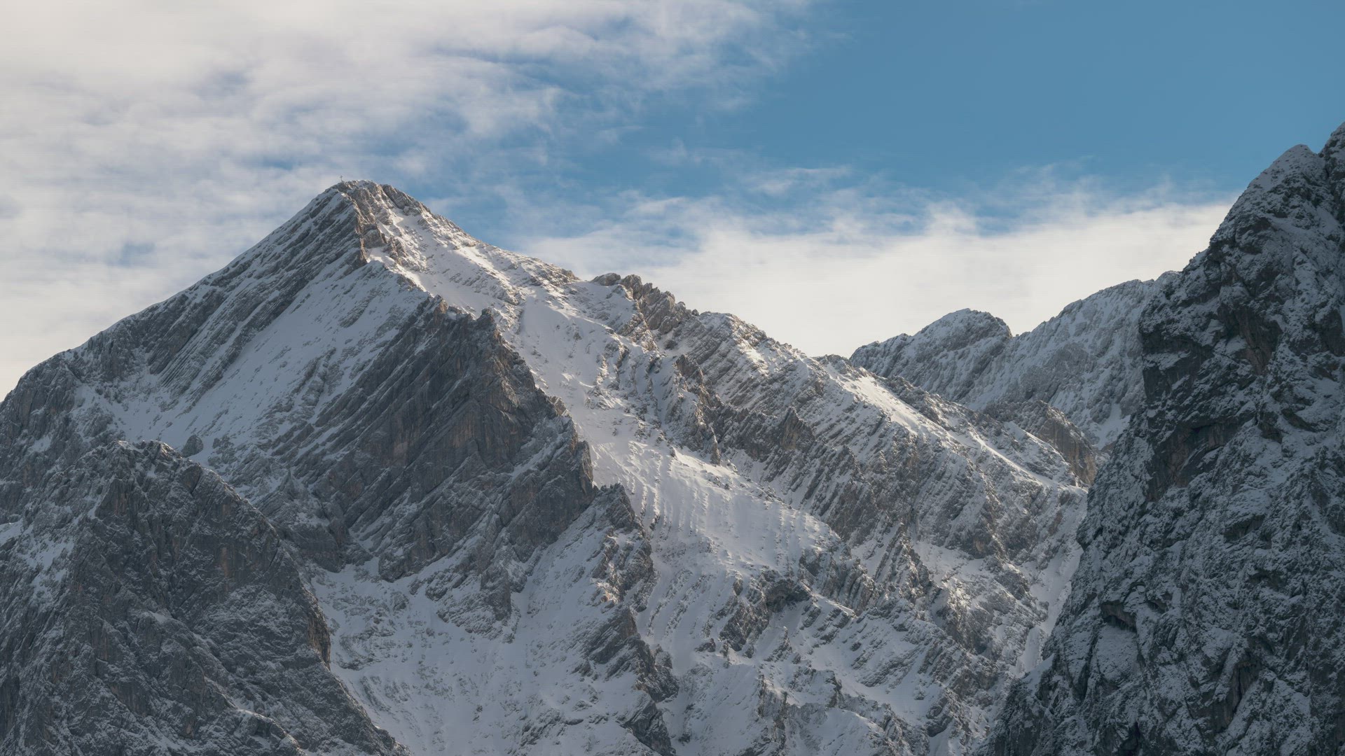 Timelapse of clouds clearing behind a mountain peak in afternoon sun light.