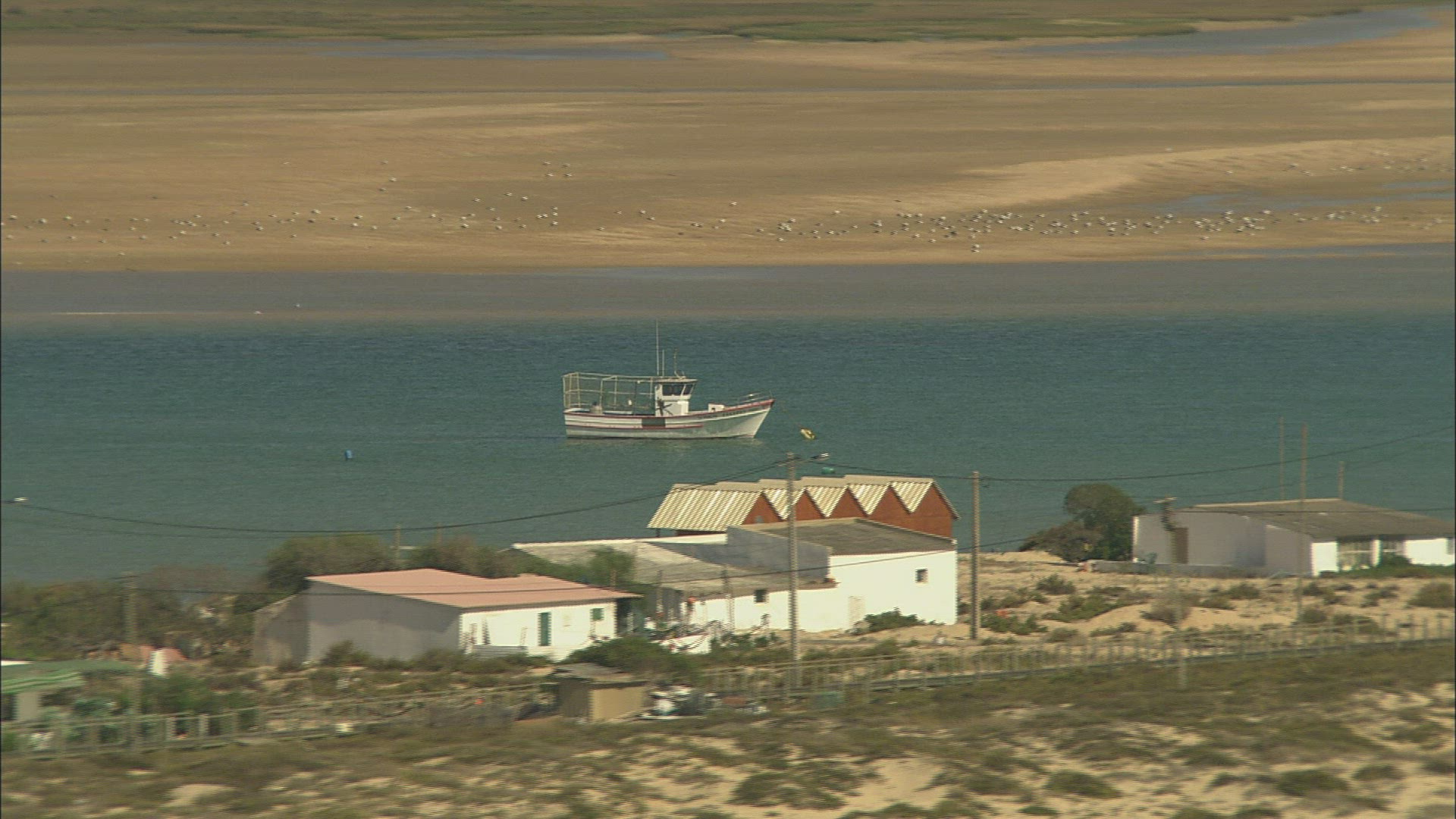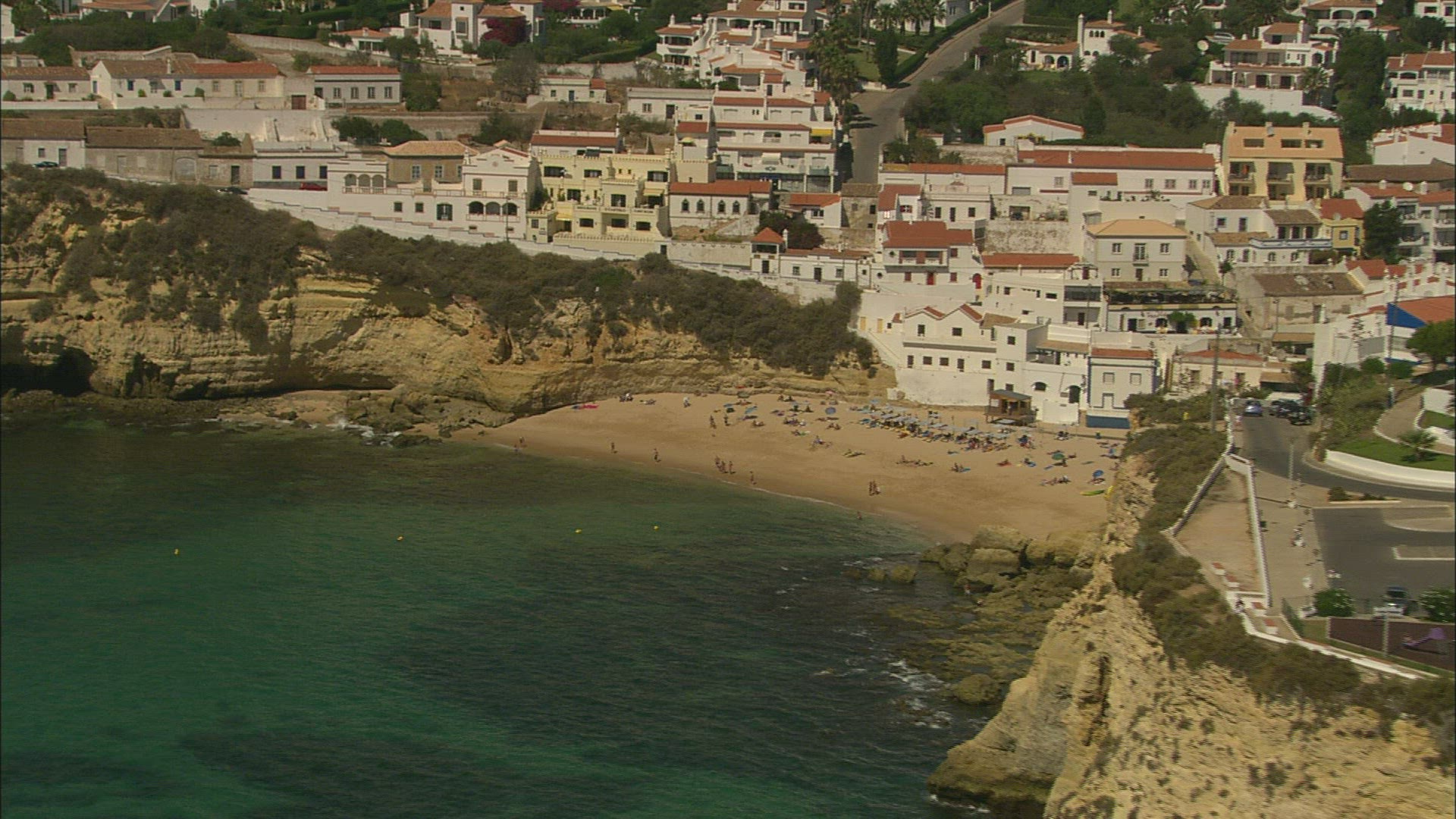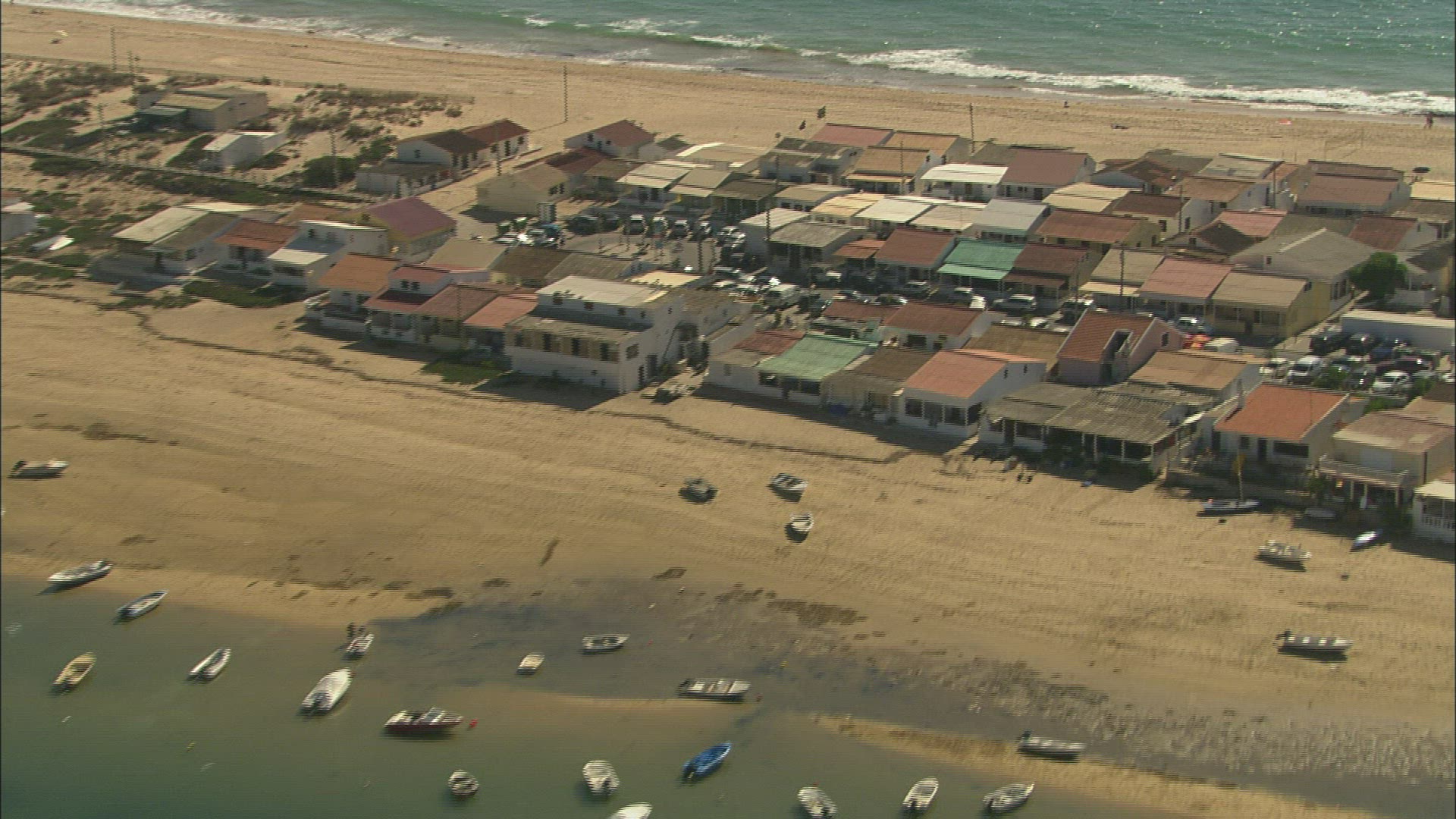 > Fly over seaside houses by the sea beach, Albuferia , Portugal