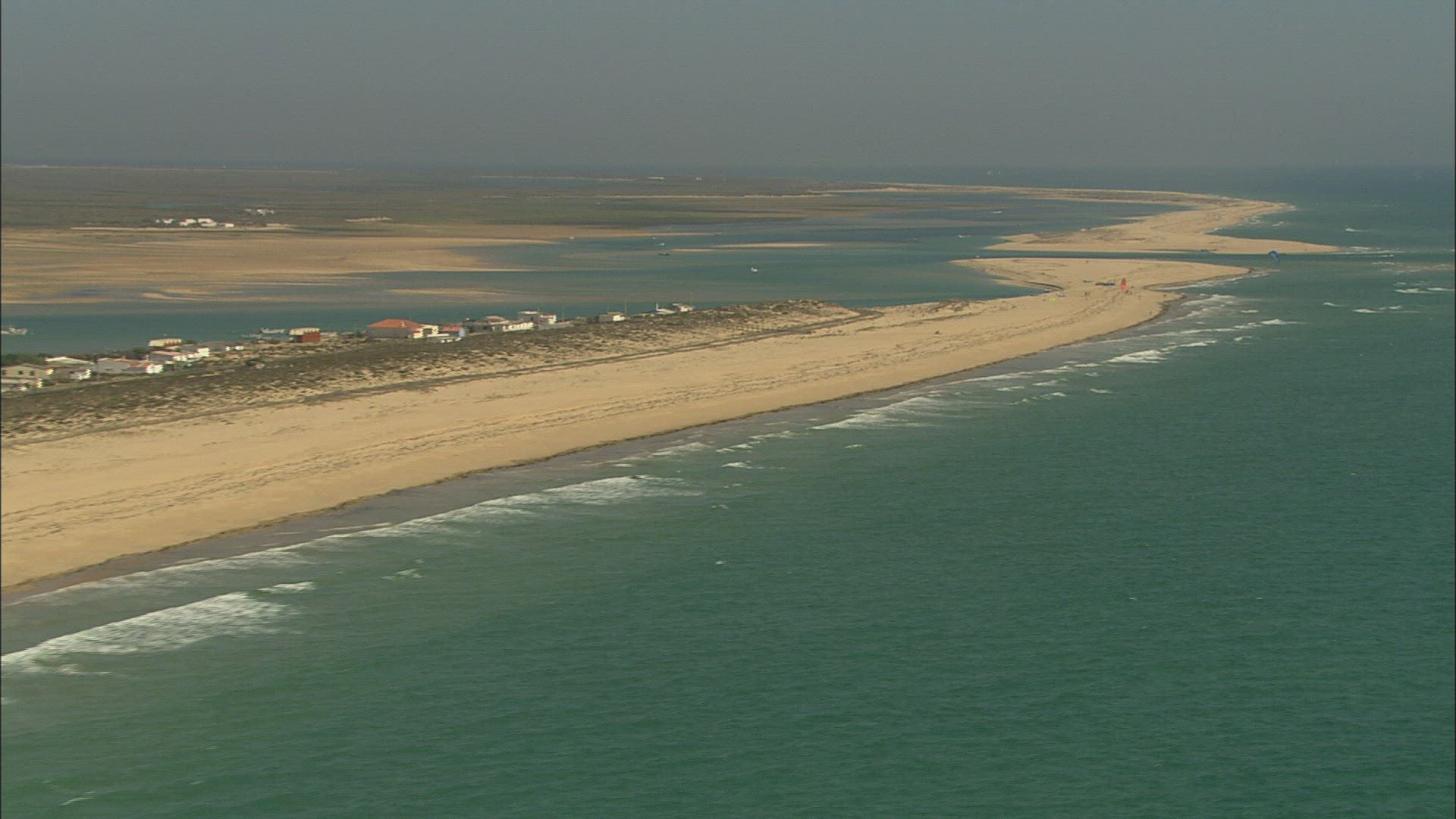 Fly over seaside houses by the sea beach, Albuferia , Portugal