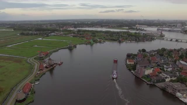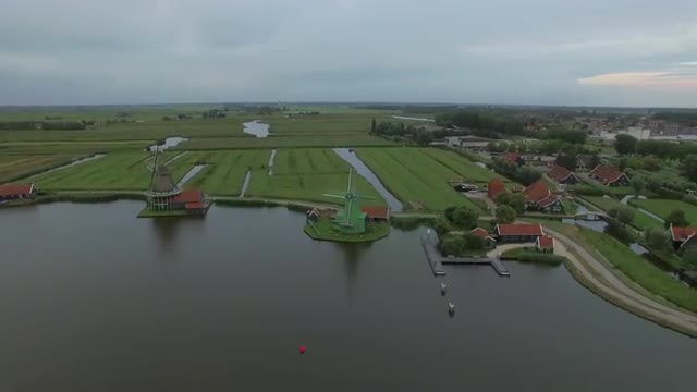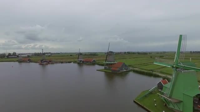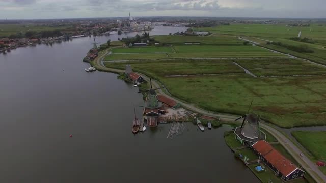 4K Drone footage of Zaanse Schans, a neighborhood in the Dutch town of Zaandam, near Amsterdam. Historic windmills and distinctive green wooden houses were relocated here to recreate the look of an 18th/19th-century village.