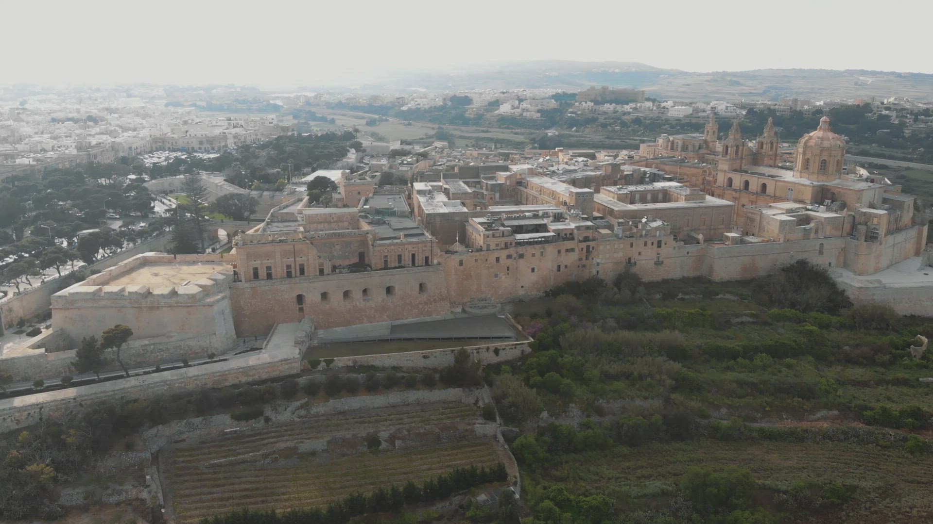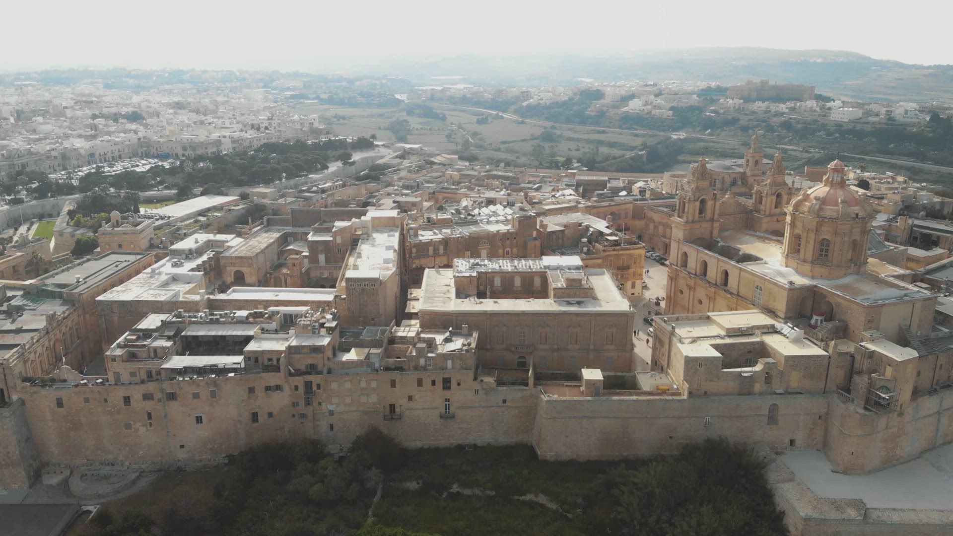> Historic cityscape of Mdina, overlooking St Paul's Cathedral - Aerial Upward Reveal Shot