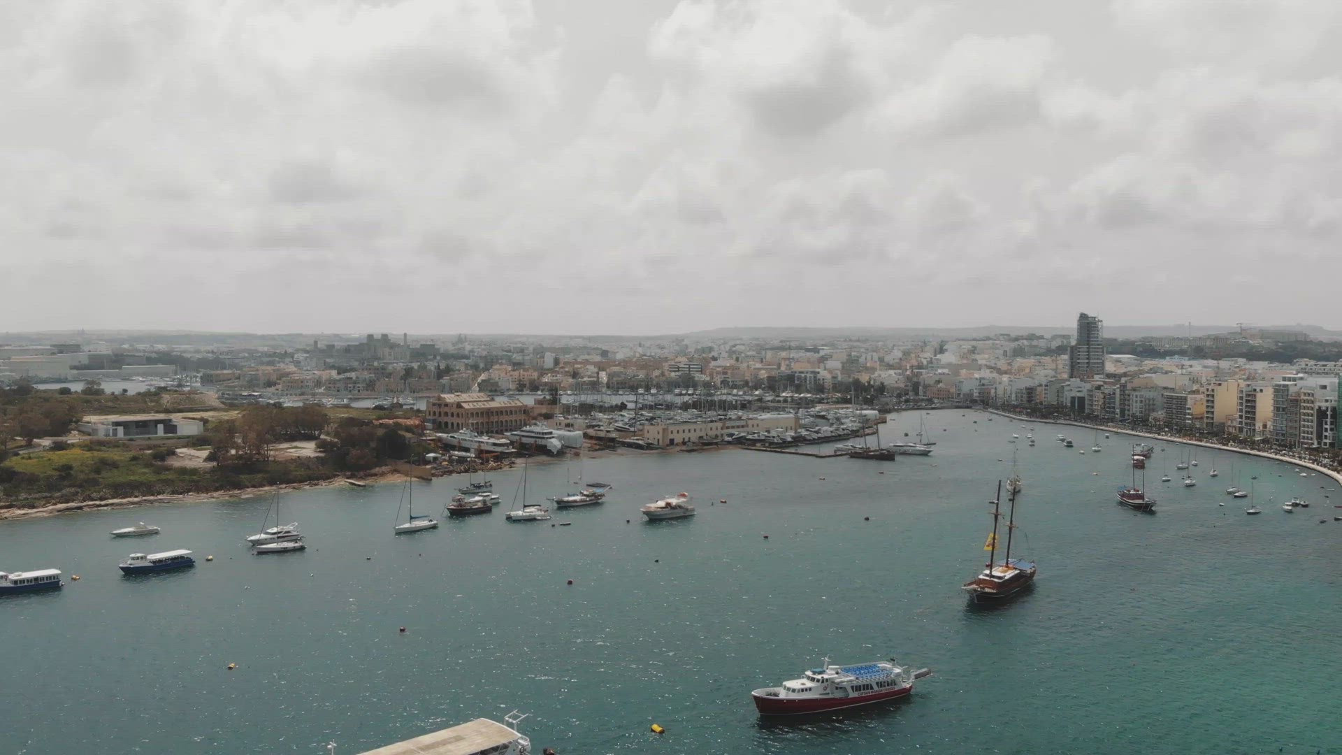 4K Drone Footage of Sliema, a resort town on the east coast of the Mediterranean island of Malta. The waterfront features a long promenade and the 18th-century polygonal Fort Tigné in the south.