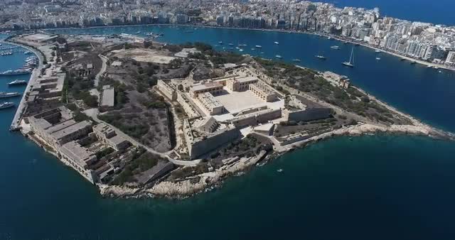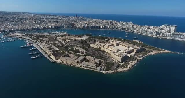 4K Drone Footage of Sliema, a resort town on the east coast of the Mediterranean island of Malta. The waterfront features a long promenade and the 18th-century polygonal Fort Tigné in the south.