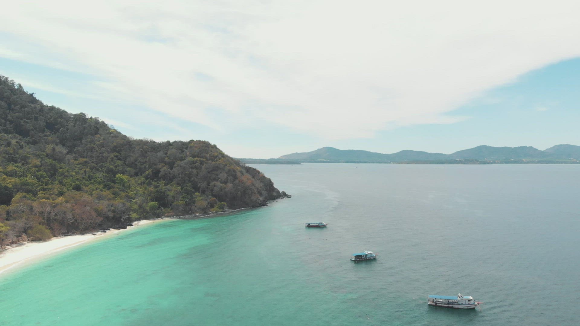> Emerald shallow shoreline and lush green coast of Banana Beach in Coral Island (Koh Hey), Thailand -