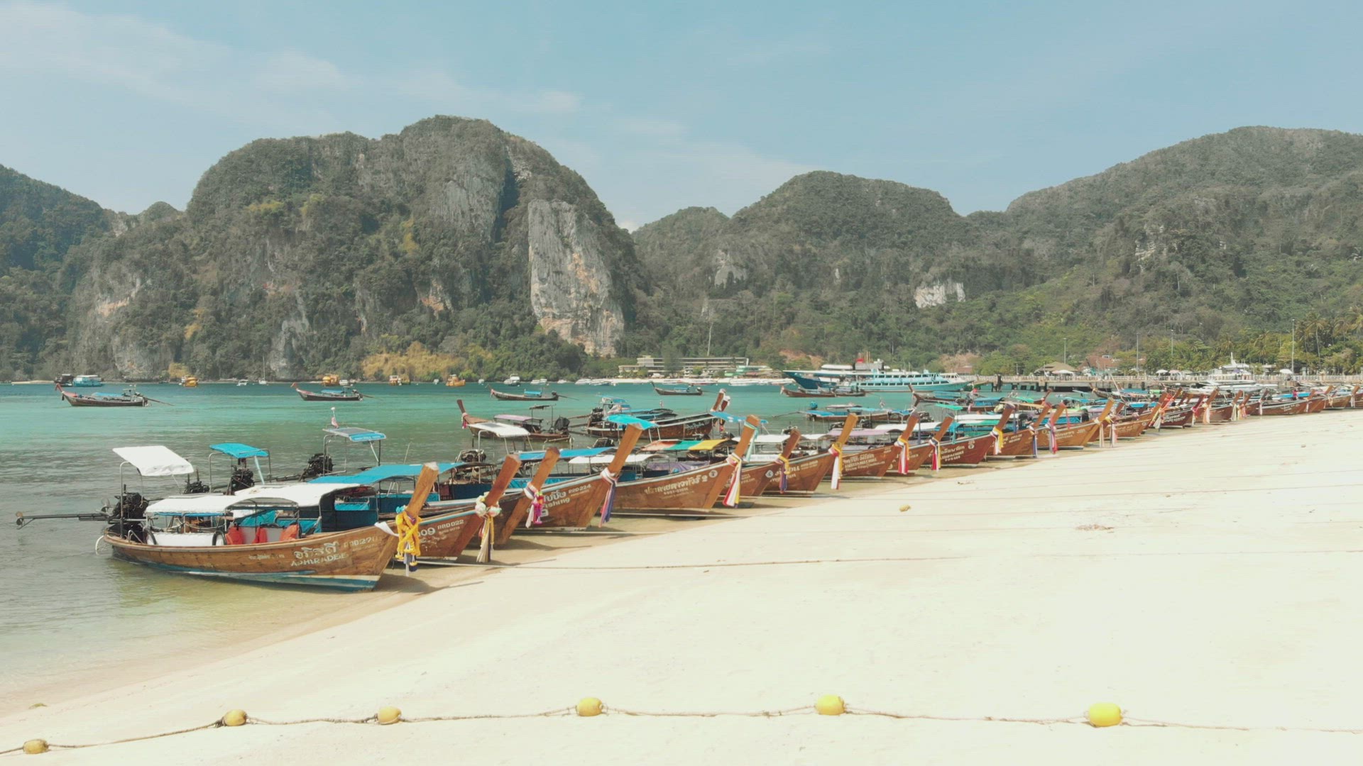 > Aerial approaching Koh Phi Phi Don, paradise bay with white beaches, Thailand