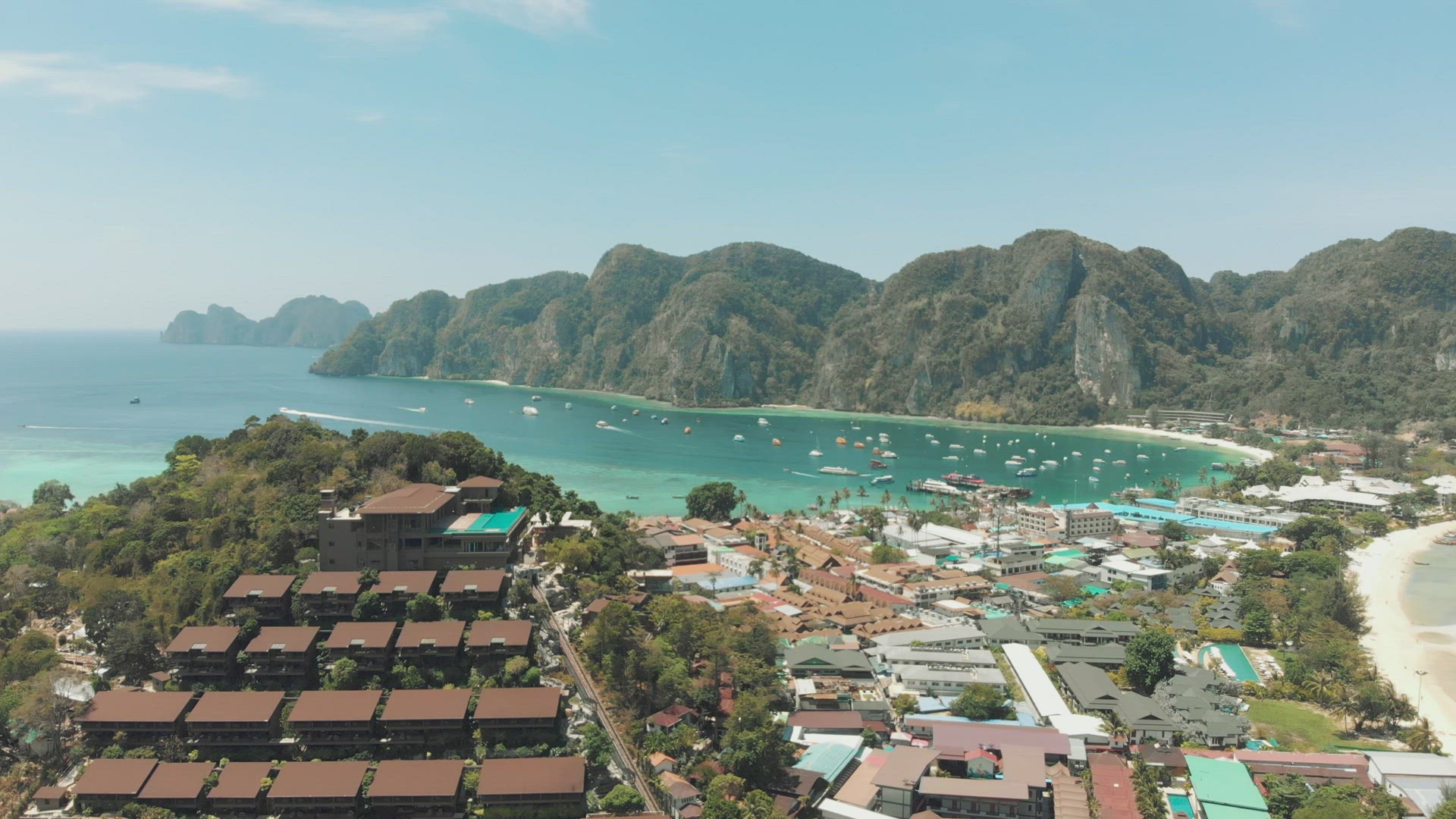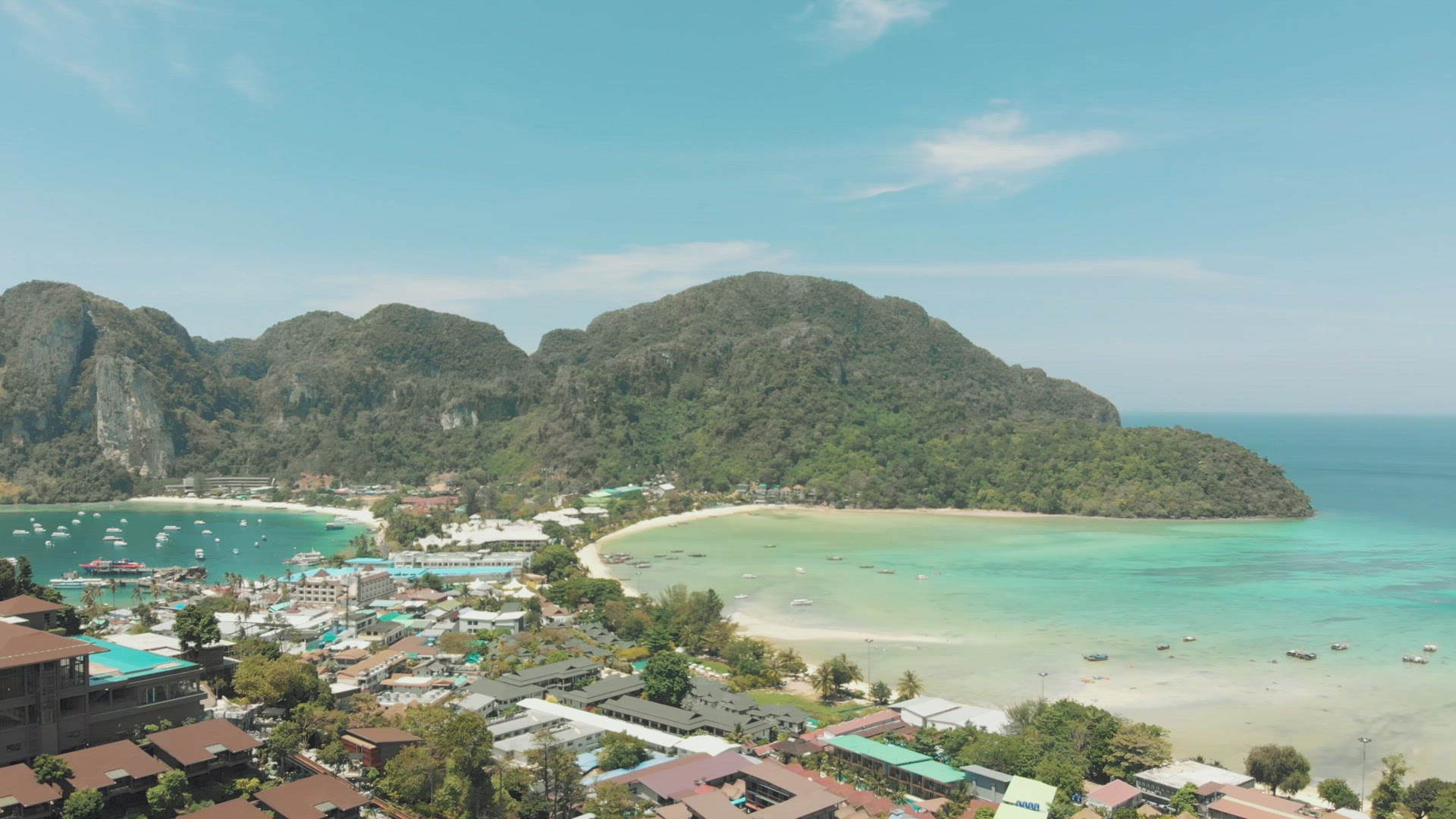 > Divine Loh Dalum Beach awash with warm Andaman sea waters in Ko Phi Phi Don Island, Thailand - Aeria