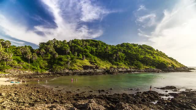> Reveal of Ton Sai Beach encircled by enchanting Ko Phi Phi Don Island Landscape, Thailand - Aerial F