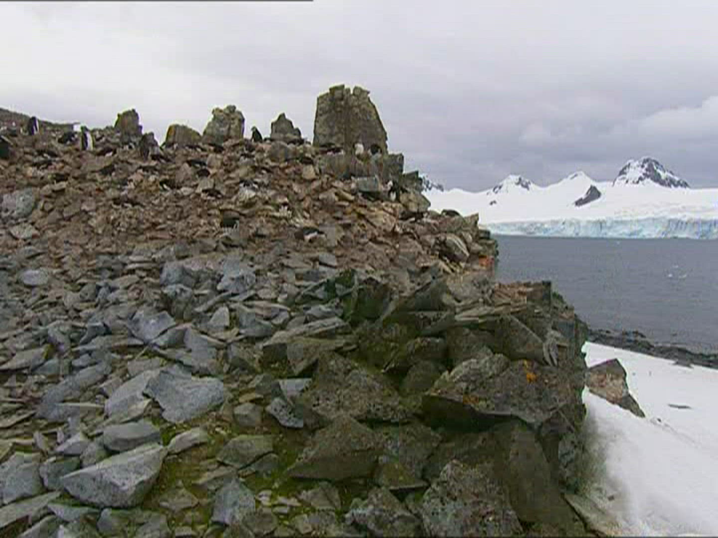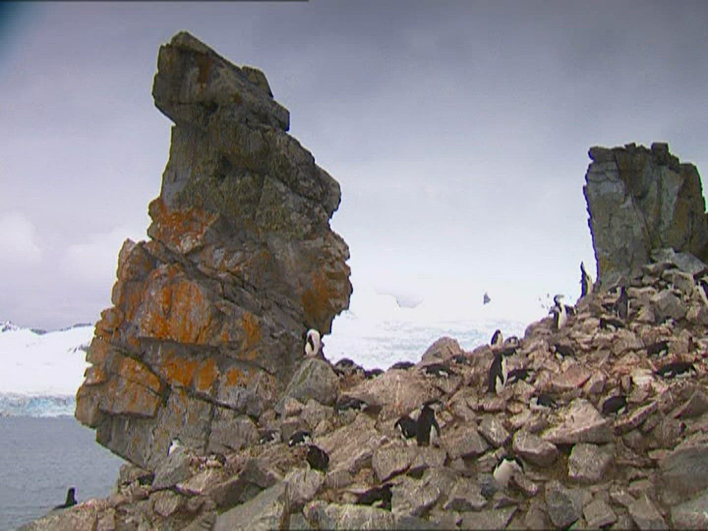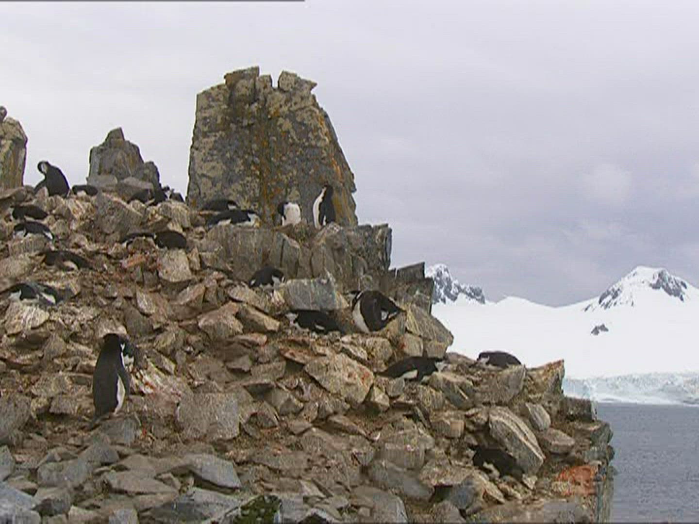 > Gentoo penguins (Pygoscelis papua) on rocks, Cuverville Island, Antarctica