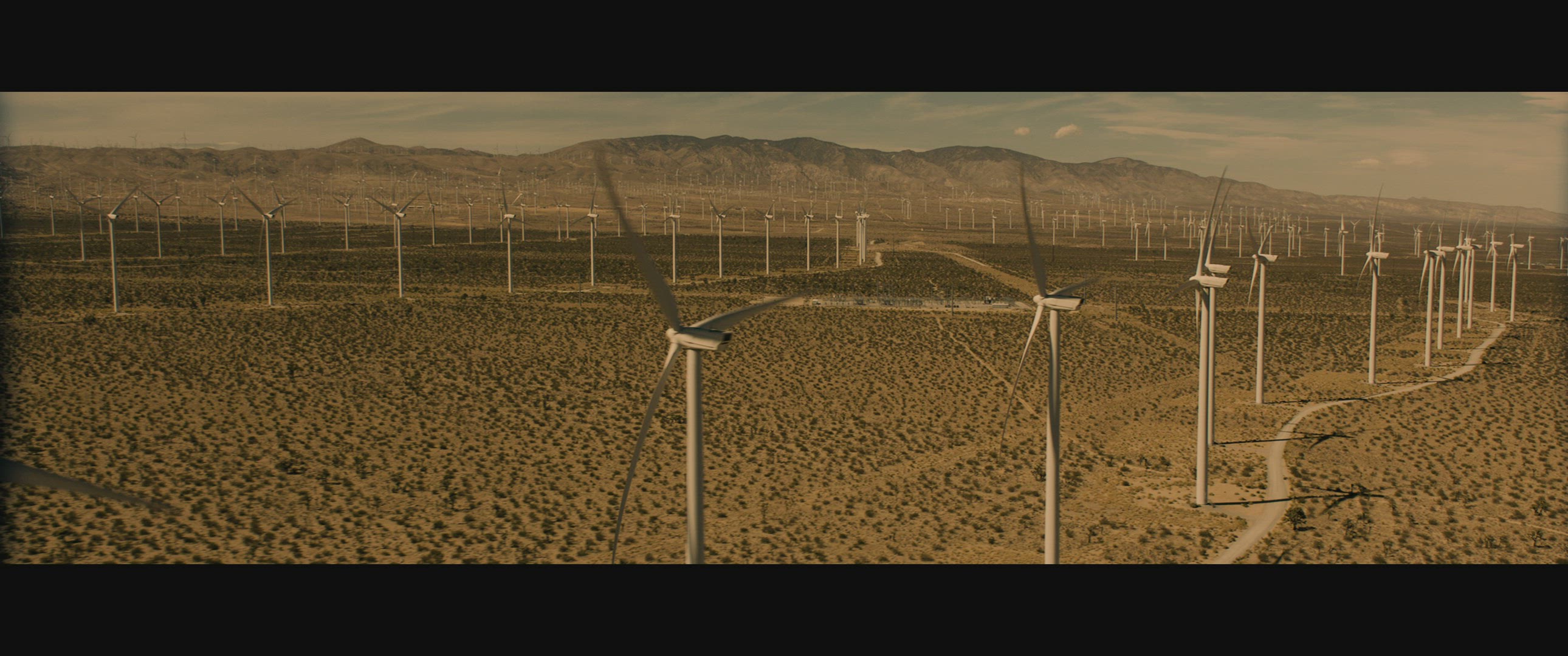 Wide aerial shot over wind turbine farm