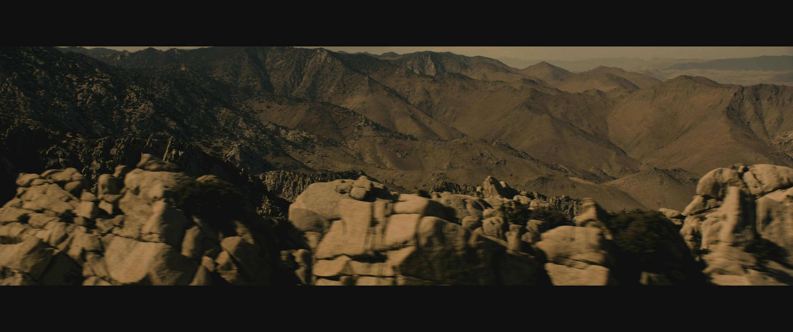 Wide aerial shot of desert mountains
