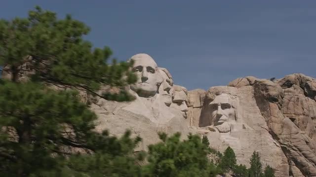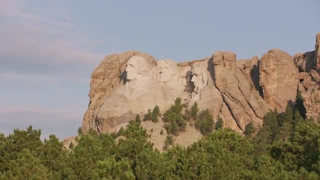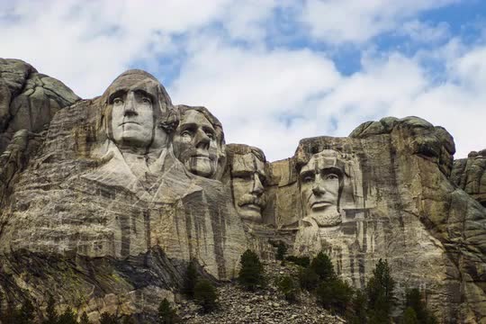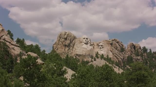 Clouds moving over Mount Rushmore in the Black Hills during timelapse in South Dakota, U.S. presidents George Washington, Thomas Jefferson, Theodore Roosevelt and Abraham Lincoln.